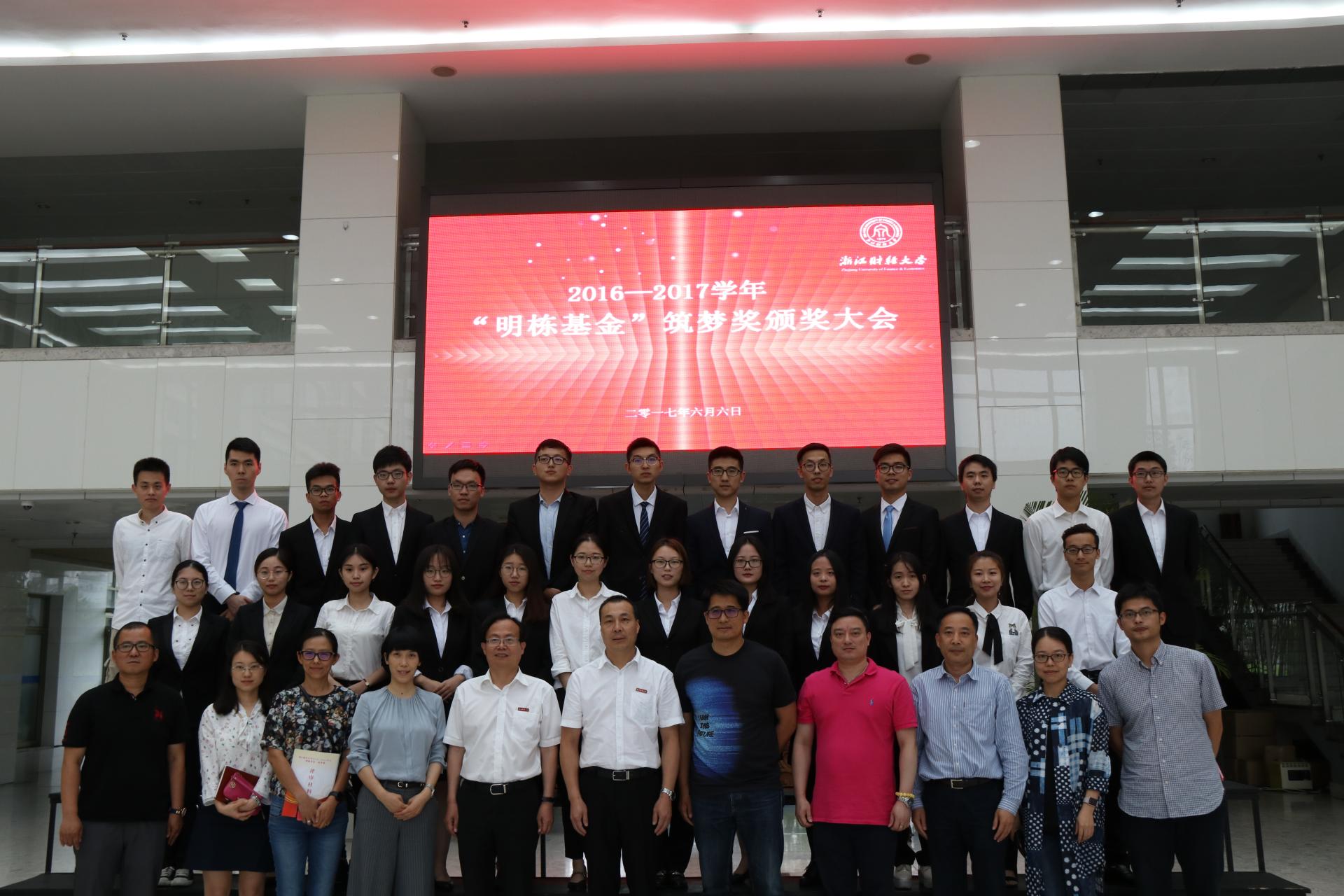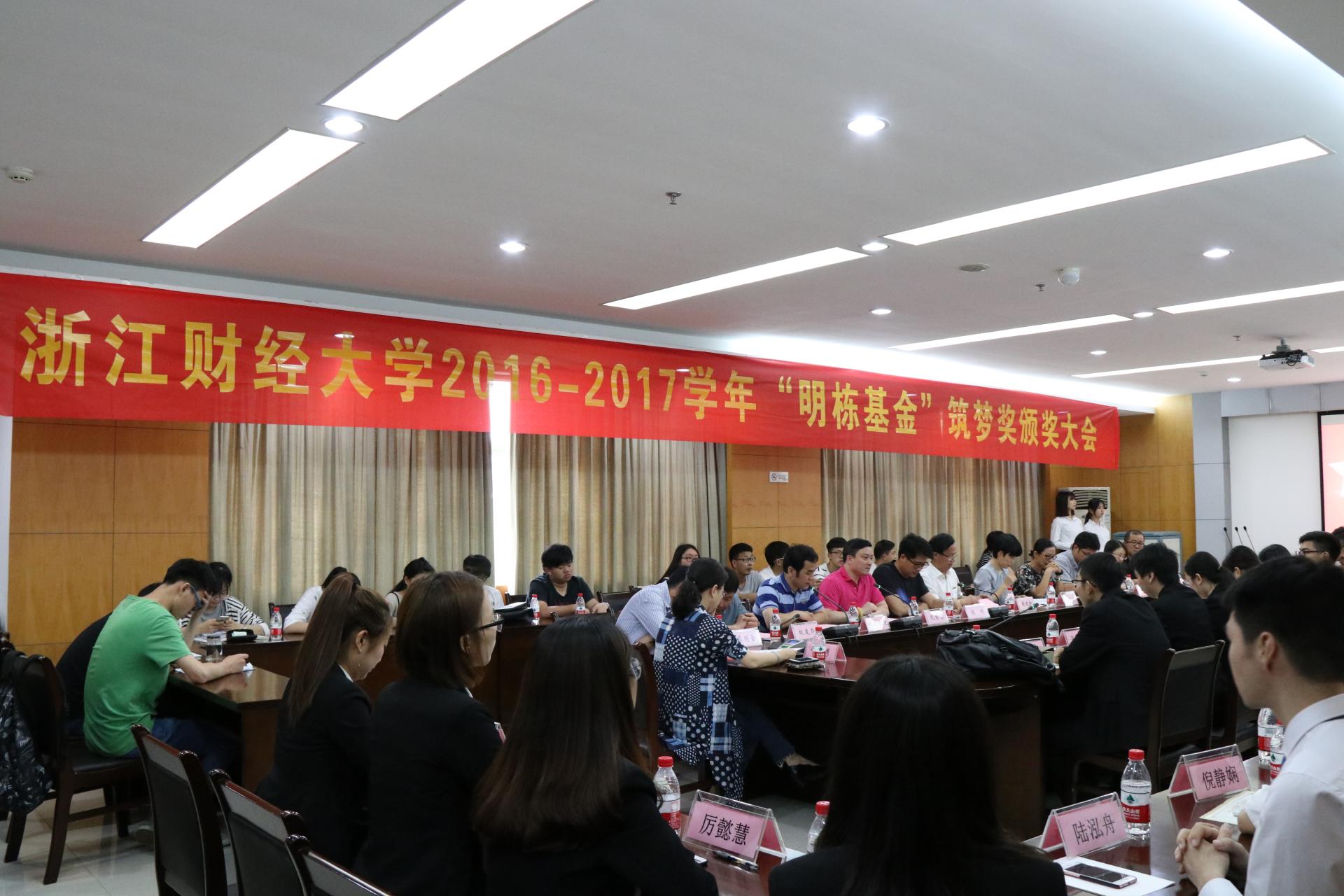 2016-2017学年“明栋基金”筑梦奖颁奖大会在行政楼200隆重举行。浙江盈阳资产管理股份有限公司总裁楼栋、蓝山投资有限公司总裁王柳琳、浙江盈阳资产管理股份有限公司总经理孔繁岗、关瑞慈善基金会执行会长吕霞、猫都论坛