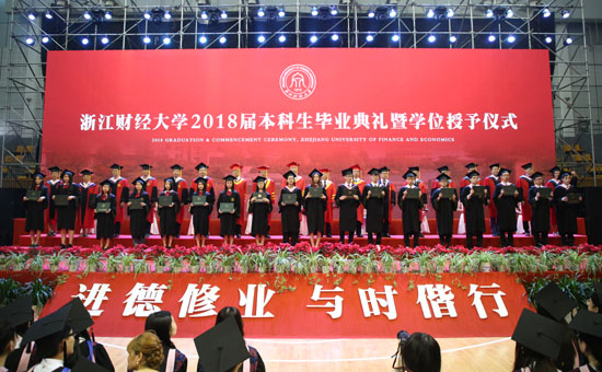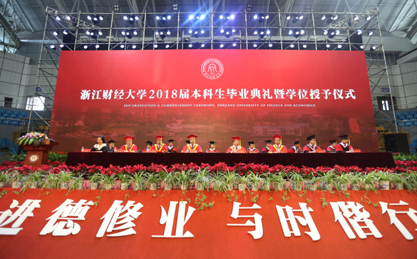 6月12日,2018届本科生毕业典礼暨学位授予仪式在学校下沙校区西体育馆隆重举行。李金昌、钟晓敏、黄建新、陈金方、徐晓东等校领导与相关职能部门负责人及各学院领导、导师代表和2018届全体本科毕业生出席了仪式。