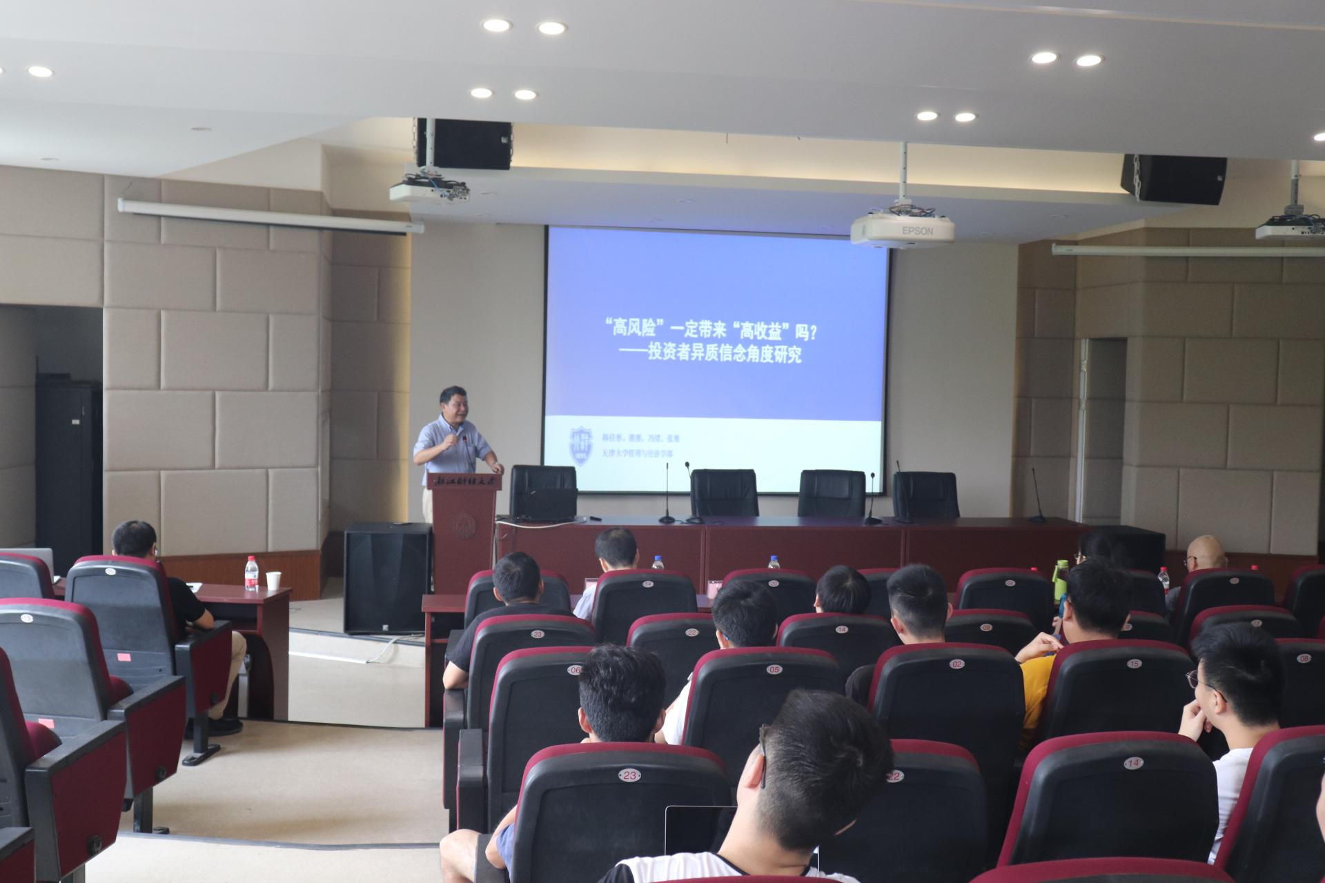 本次专题讲座开始,由熊熊教授作了主题为“‘高风险’一定带来‘高收益’吗?——投资者异质信念角度研究”的讲座,熊熊教授在开讲之前首先向大家介绍了天津大学的计算实验室金融与大数据金融研究团队以及团队的研究课题和研究成果,提到本次讲座的内容是他所在研究团队的成果之一。熊熊教授从投资者异质性信念开始讲起,向大家介绍了国内外学者对异质信念的研究结果,即异质信念会对不同风险的投资组合收益产生影响。接下来,熊熊教授对异质信念研究的过程进行了介绍,通过数据和指标构造,进行描述性统计、投资组合分析和回归分析,向大家证明了Beta放大了投资者的异质信念,而且对于高Beta投资组合,投资者异质信念程度的增加会降低其未来收益。最后,熊熊教授就研究的结果提出提高市场透明度和加大投资者教育的结论。