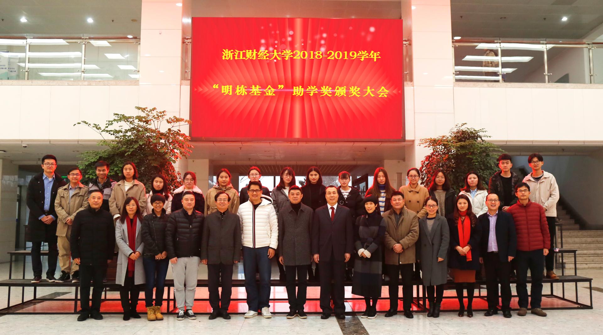 12月20日下午,2018-2019学年“明栋基金”助学奖颁奖大会再度在下沙校区举行。校党委书记李金昌、校党委副书记黄建新、蓝山投资有限公司董事长王晓明、浙江盈阳资产管理股份有限公司创始人楼栋、蓝山投资有限公司总裁王柳琳、浙江盈阳资产管理股份有限公司总经理孔繁岗、关瑞慈善基金会执行会长吕霞、学院党委书记蔡国金、学院党委副书记叶秀、相关部门负责人及获奖学生等参加了此次活动。颁奖大会由我党委副书记叶秀主持。