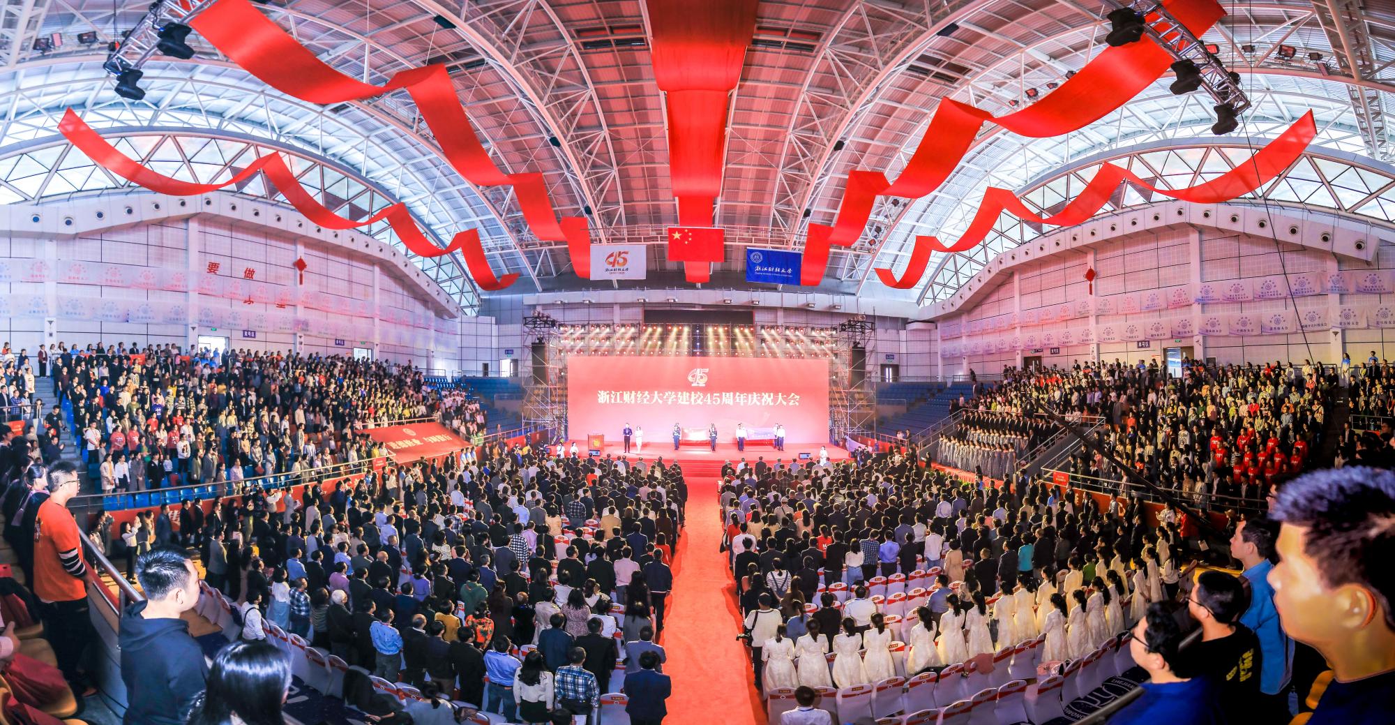 45周年校庆大会于西体育馆盛大召开,校党委书记李金昌的致辞开篇,抒发了对我校未来发展的美好愿景。大会上进行了引领“功勋奖”、拓荒“金牛奖”、“最美校友”等奖项的颁奖,对“浙财氏家”校友企业、“浙财世家”校友家庭进行授牌。