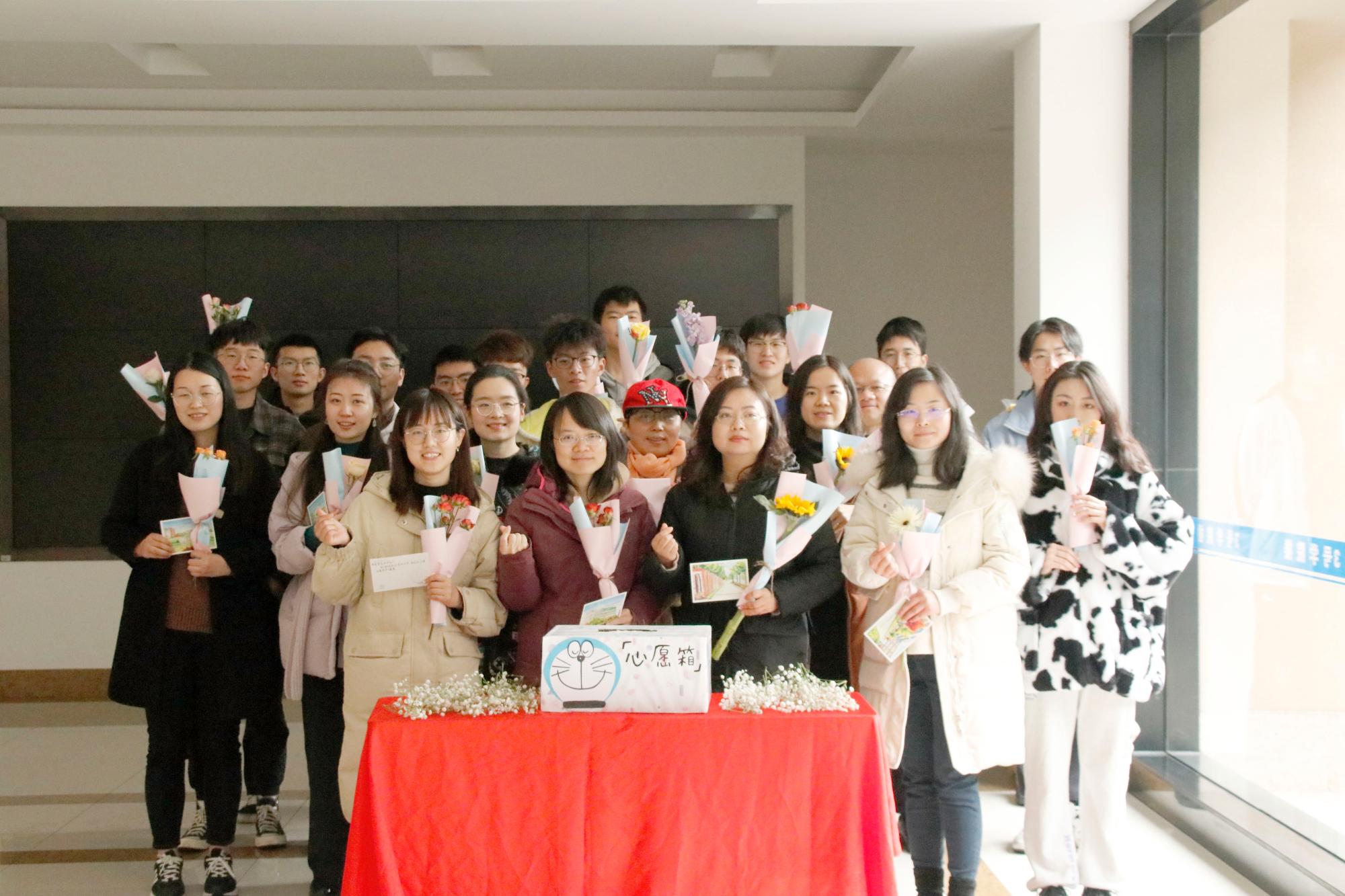 楼前欢声笑语,老师们在“心愿箱”中抽取的心愿卡,卡片上写着“希望我考研的孩子们都能顺利上岸”“我希望我的学生积极上进,取得优异成绩”“我希望能够去电影院看一场电影”等心愿。而心愿卡上的内容,则由同学们帮助老师完成,希望给老师们带来春日里的温暖与感动。随后,学生代表们一一为老师们献上鲜花,并合影留念。
