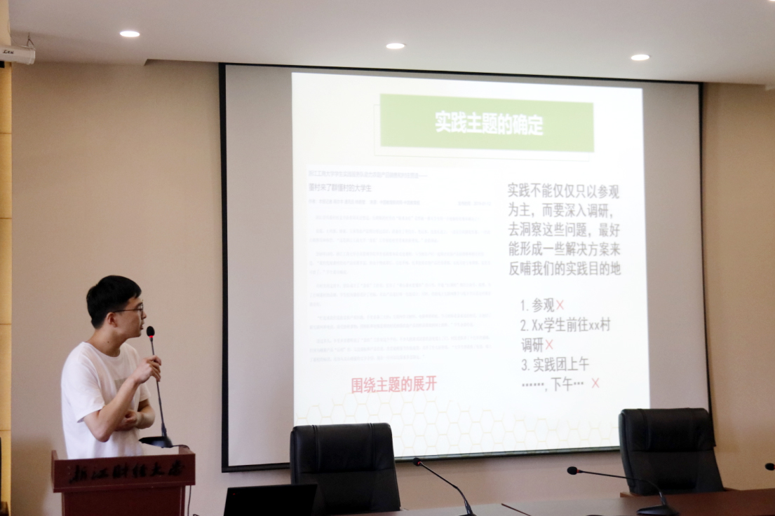 2020年暑期社会实践优秀团队——“振兴乡村求发展,‘桐洲’共济绘蓝图”实践服务团的18金融学专业韩宇昂同学做了分享,他围绕实践主题的确定、实践形式的创新、实践宣传的多维化三个方面为2021年的实践团队提供了具体有效的建议。