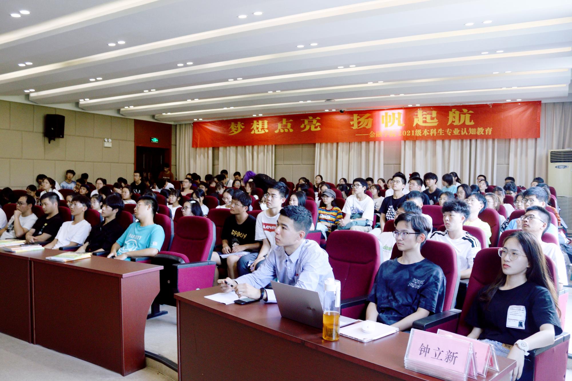 2021级本科新生专业认知教育在学院楼顺利举行。金融系主任金骋路、金融工程系主任钟立新、信用管理系主任叶谦、保险系主任周海珍、投资系主任徐峰、国际教育中心主任党超出席并作为主讲人参加了本次认知教育,新生辅导员刘仰璟主持,全体2021级本科新生参加了本次大会。