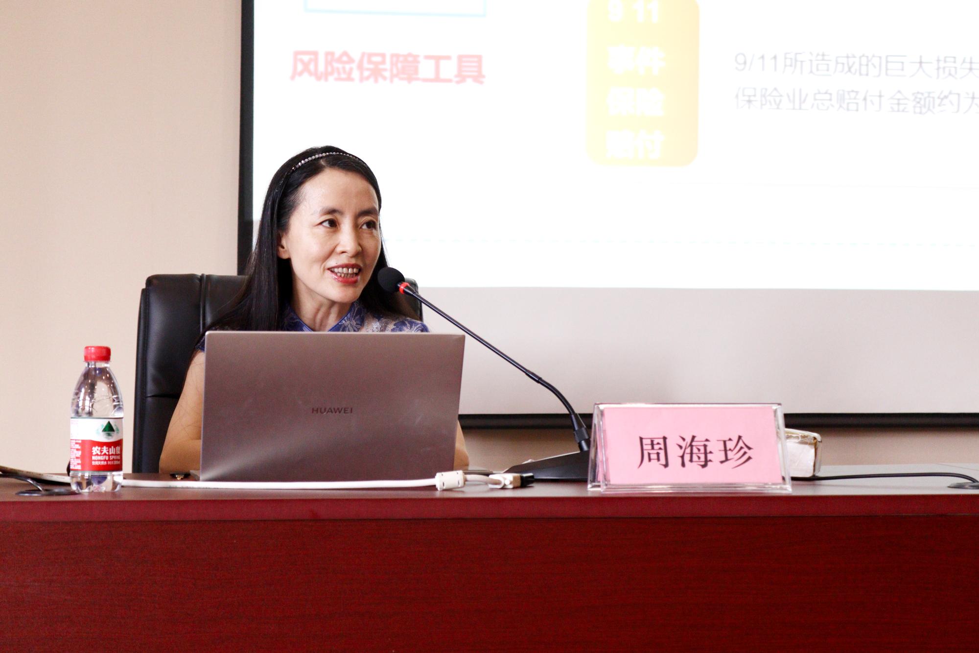 保险系主任周海珍老师通过河南郑州暴雨保险理赔和“911”事件保险赔付两个具体事例开篇,向同学们明确了保险是一项风险保障工具这一理念。接着,她用保险业在新冠肺炎疫情中充分发挥社会责任以及保险五年蝉联老百姓投资首选的例子说明了保险的重要作用。她还详细为同学们介绍了保险专业学什么,就业去向和就业前景。