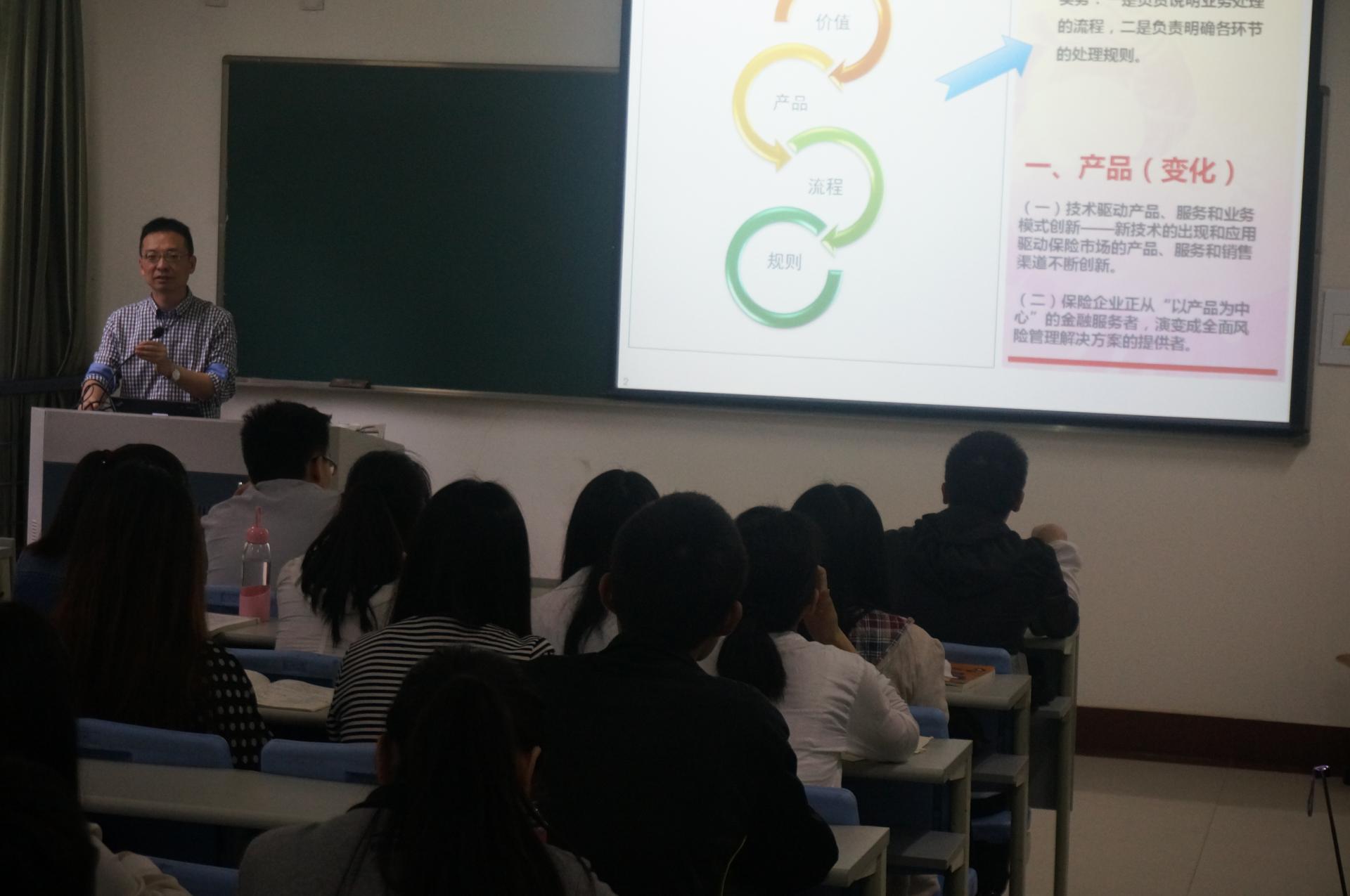 作为《保险学》课程教学方式改革创新的一次尝试,在任课教师叶晓凌老师的邀请下,胡先生在百忙之中抽出时间,来到我校《保险学》课堂为同学们作了 “保险公司销售与理赔—产品、流程、规则、价值”的专题讲座。不同于我们从教科书上所学的理论知识,胡先生以机动车辆保险承保与理赔为出发点,通过各种翔实的案例与资料,向同学们全方位的展示了互联网时代大数据的应用对财产保险实务带来的巨大变革,以及由此引发的对现有保险理论的重新思考和跟进研究。同学们全神贯注地聆听,并与胡岱磊先生进行了互动提问,课堂气氛活跃。类似于基地精英进入进课堂的方式,无异于对同学们开拓眼界、了解教材之外的实务知识、加深课堂理论知识的掌握、提高同学们专业课学习兴趣都有着极大的帮助。