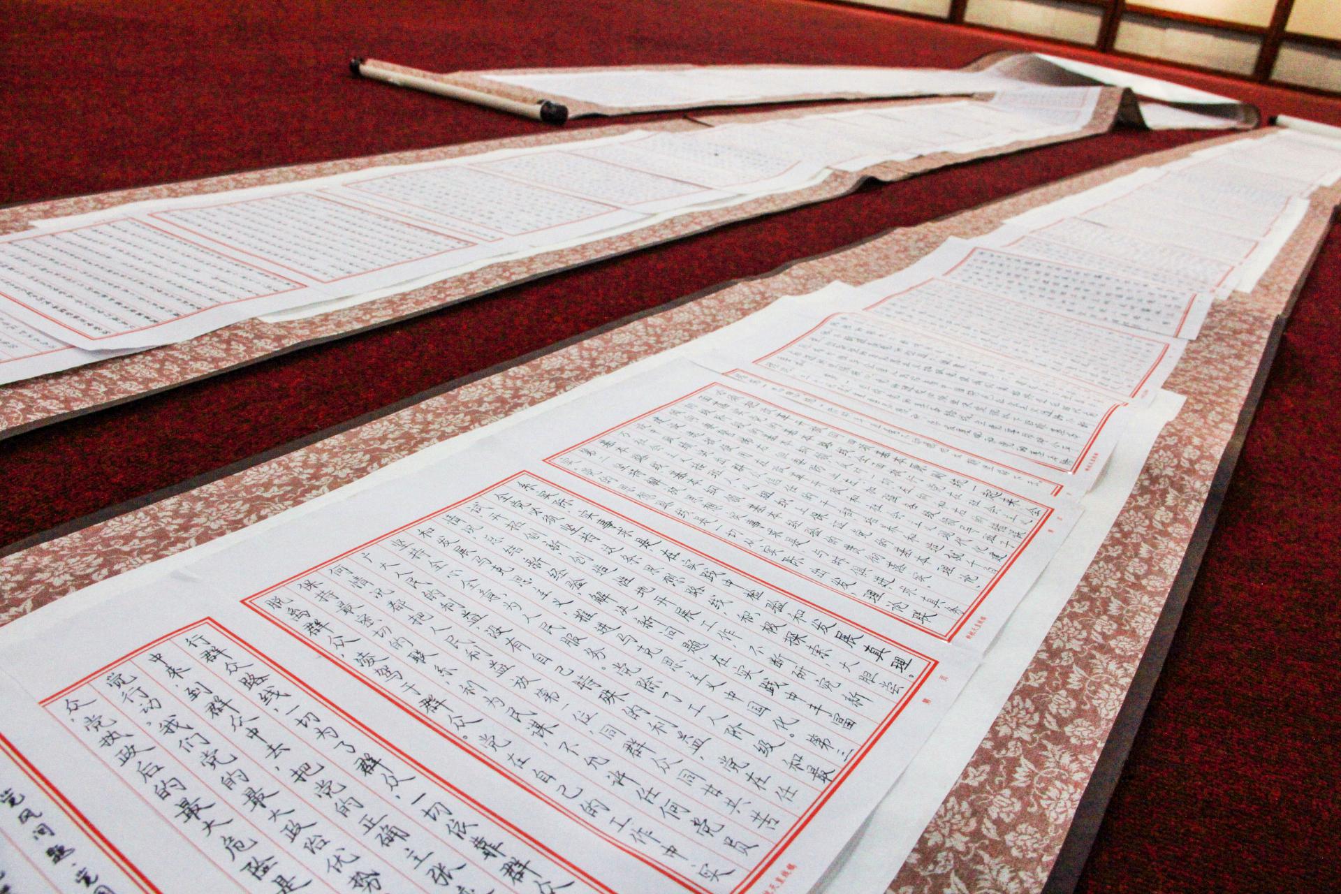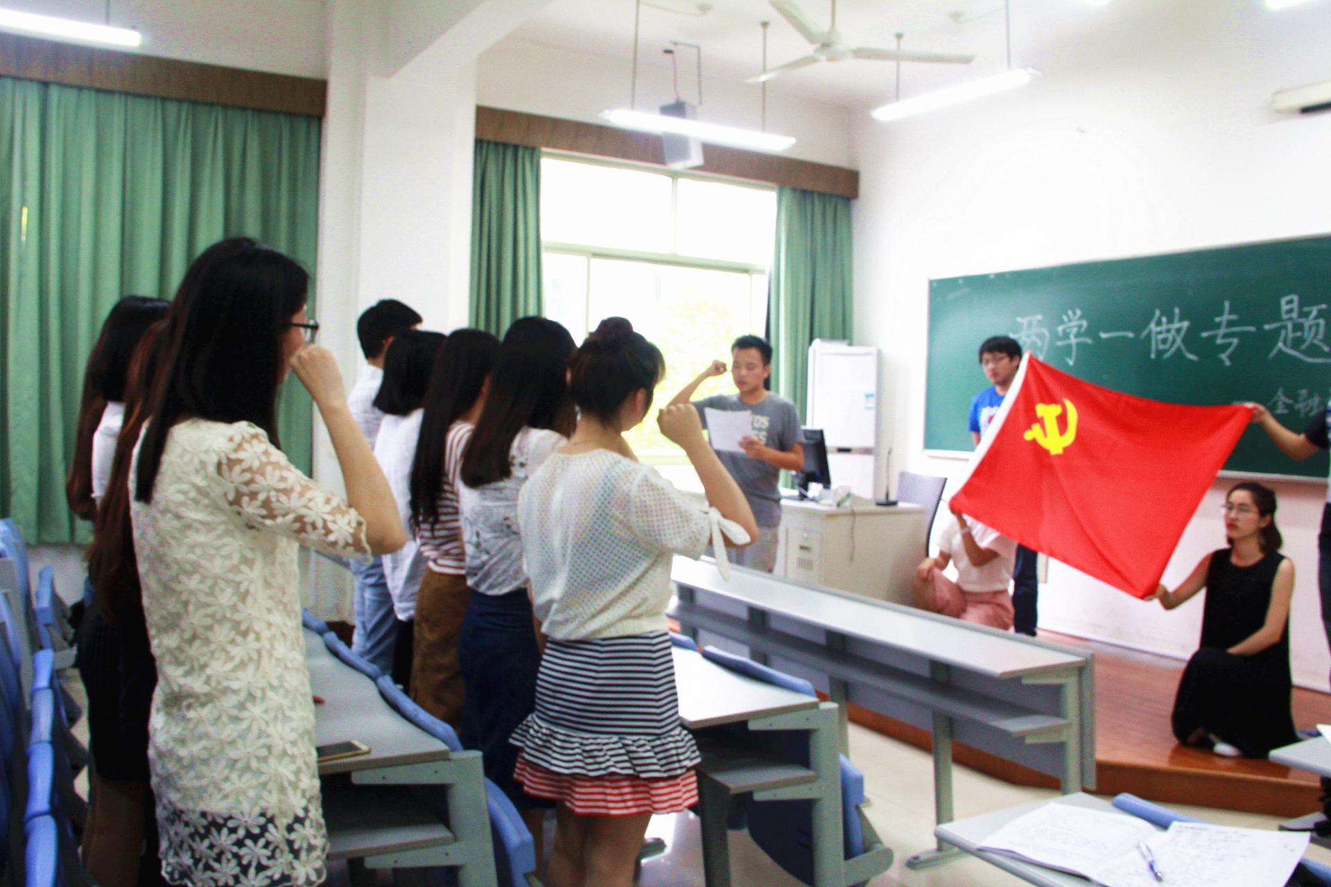 根据学习计划,学生第三党支部于5月31日开展了“党在心中,聚力成章”手抄党章书法比赛,33名党员历时一个星期,共同抄写党章,最终形成了一副长13米的书法作品;随后,支部全体党员进行了重温入党誓词活动。