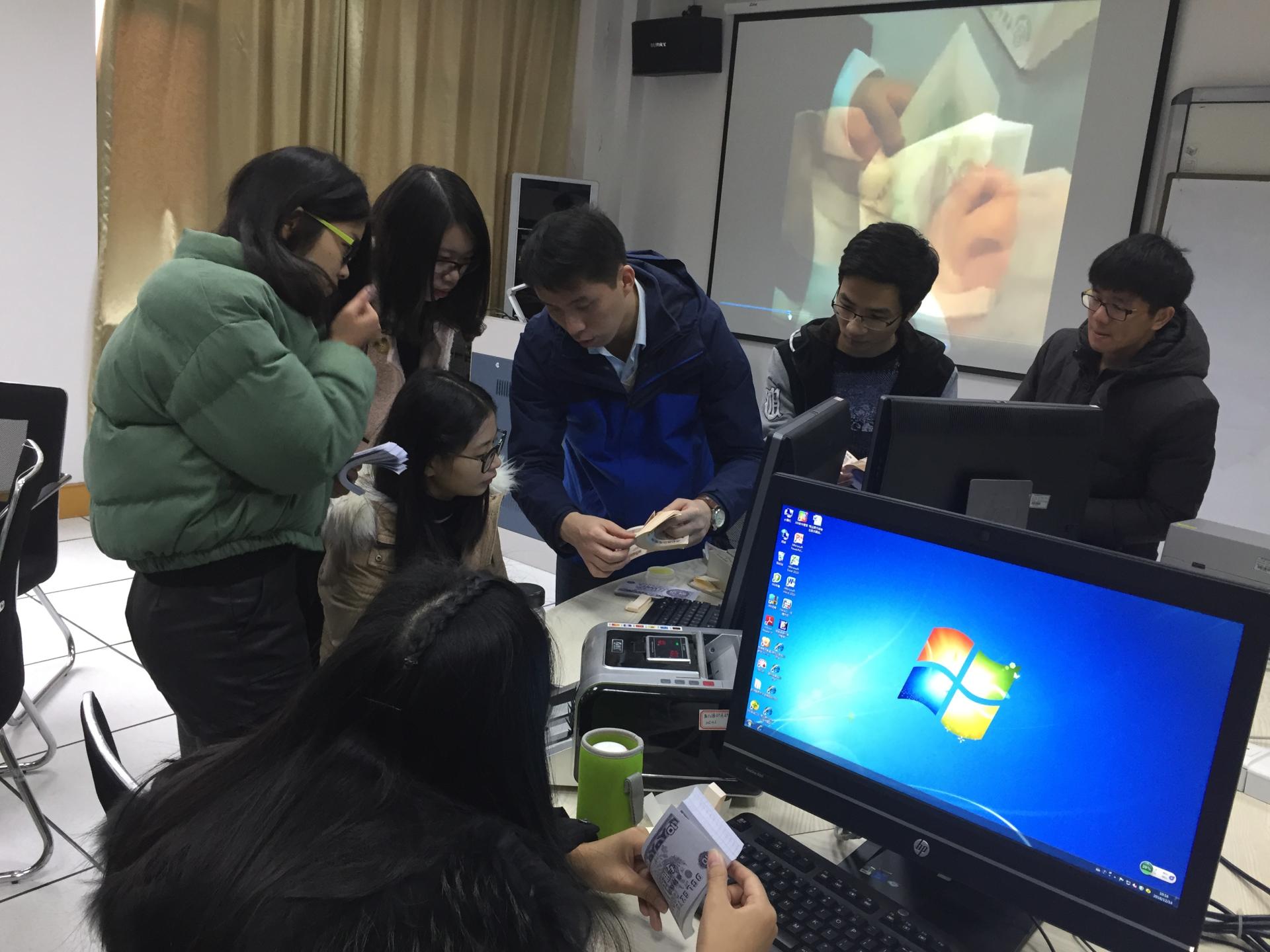 楼模拟银行实训基地,为《银行实务》课程的学生进行柜面基础技能操作培训。徐帆老师曾荣获“杭州市金融系统技能比赛”点钞第二名。他向同学们介绍了银行柜面基础技能操作培训内容和达标标准,并重点讲授了基本的点钞方法。在徐帆老师和金海霞老师的讲解和指导下,同学们用练功券进行了点钞练习,并在掌握基本要领后进行了点钞比赛。课堂气氛十分活跃热烈,同学们反映非常喜欢这样的授课内容和方式,学到了很多书本上没有的知识和技能。