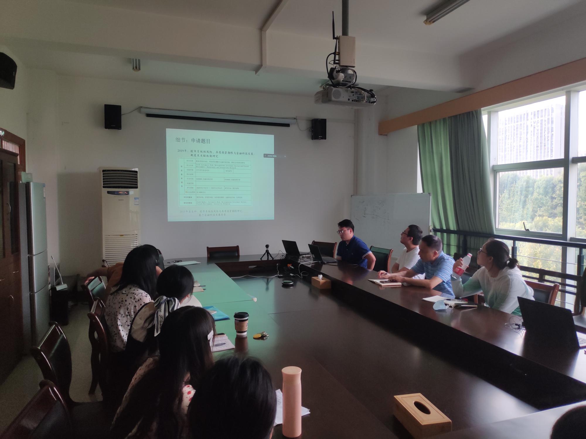 近年来国家社科基金和国家自然科学基金的申请立项情况作了简要回顾,并鼓励学院教师积极参与申报国家和省部级研究课题,不断提升自身的学术水平和学术影响力。在经验分享环节,郑燕巧副教授、金骋路博士分别从项目选题、研究思路文献整理、申请书撰写等多个角度分享了国家级课题申报中的经验和体会,并就申请书撰写中应当注意的细节问题进行了详细的讲解。最后,蔡国金书记从学校、学院和教师自身三重角度强调了课题申报的重要性,鼓励教师要提早准备、积极申报。