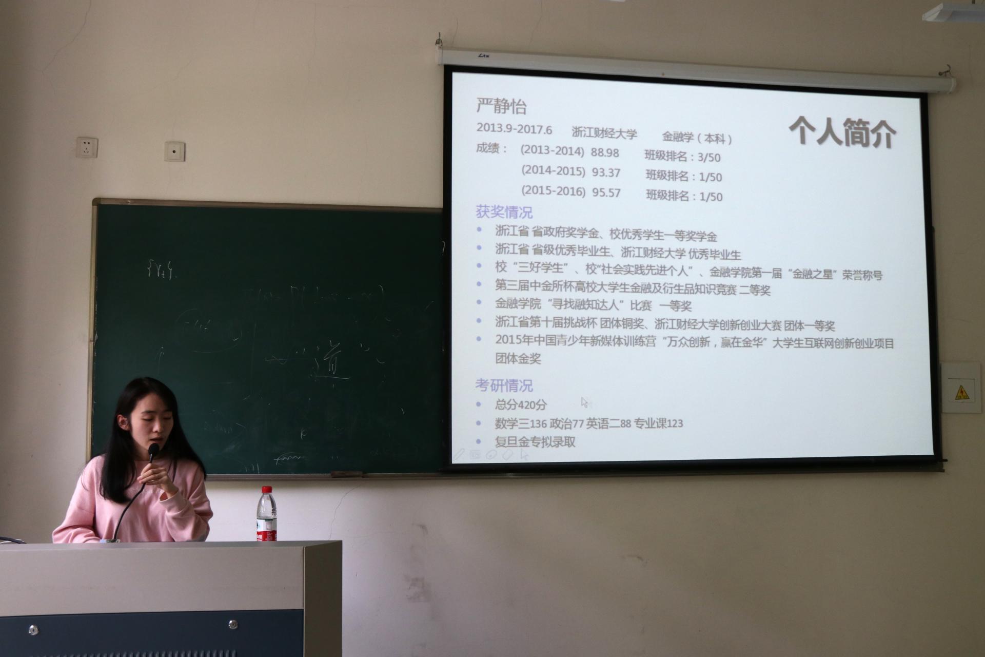 4月18日下午1:30,第三期“金才讲座”之考研篇在学院楼107顺利举行。本次讲座由13级金融学专业严静怡同学主讲。