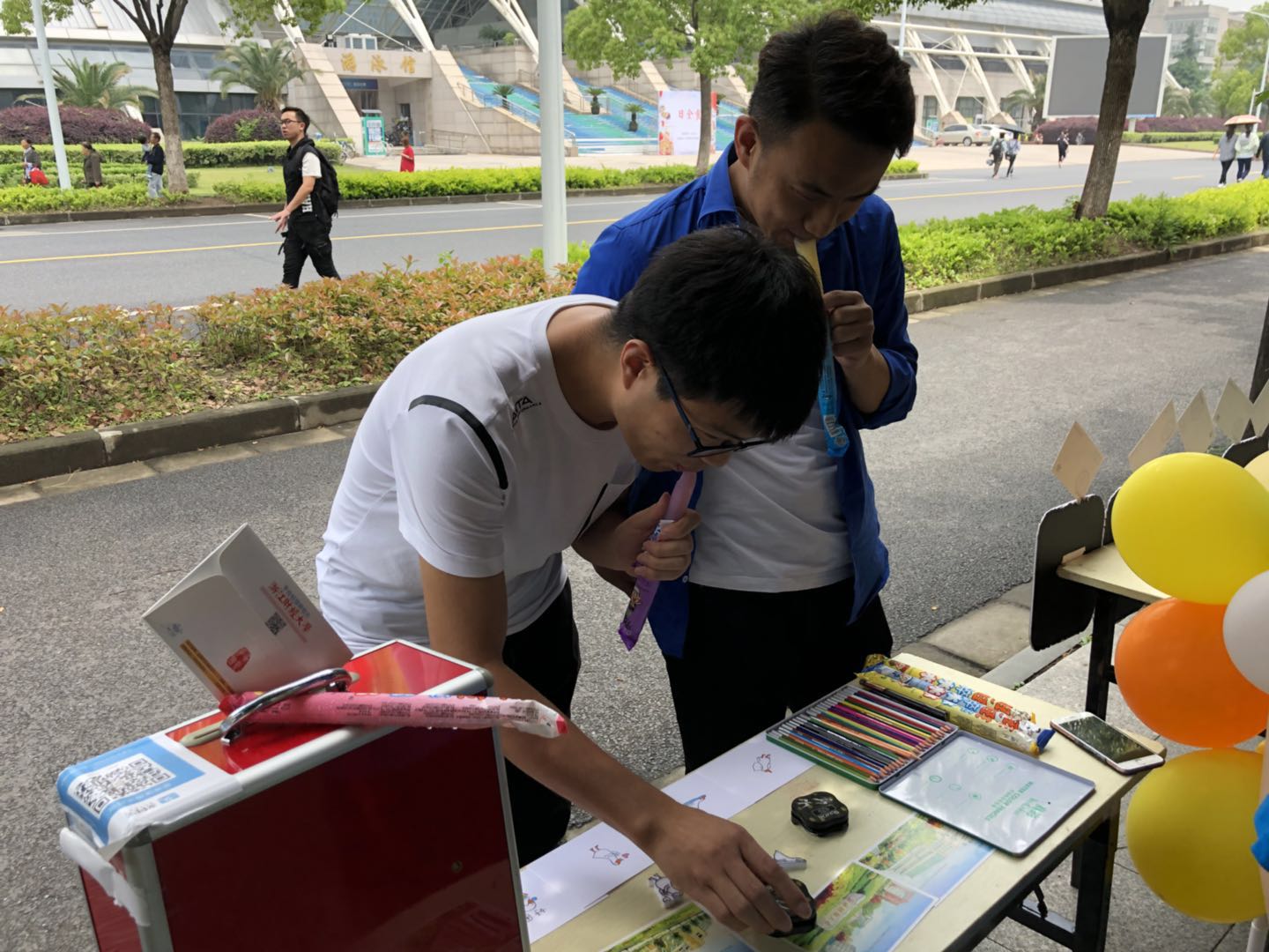 在文化长廊熙熙攘攘的人群中,穿着红马甲、蓝体恤的志愿者们形成了一道亮丽的风景线。炎热的天气阻挡不了他们乐于奉献的心,志愿者们总是保持耐心并礼貌地为路过的同学介绍此次活动,并详细地解答他们的疑惑。