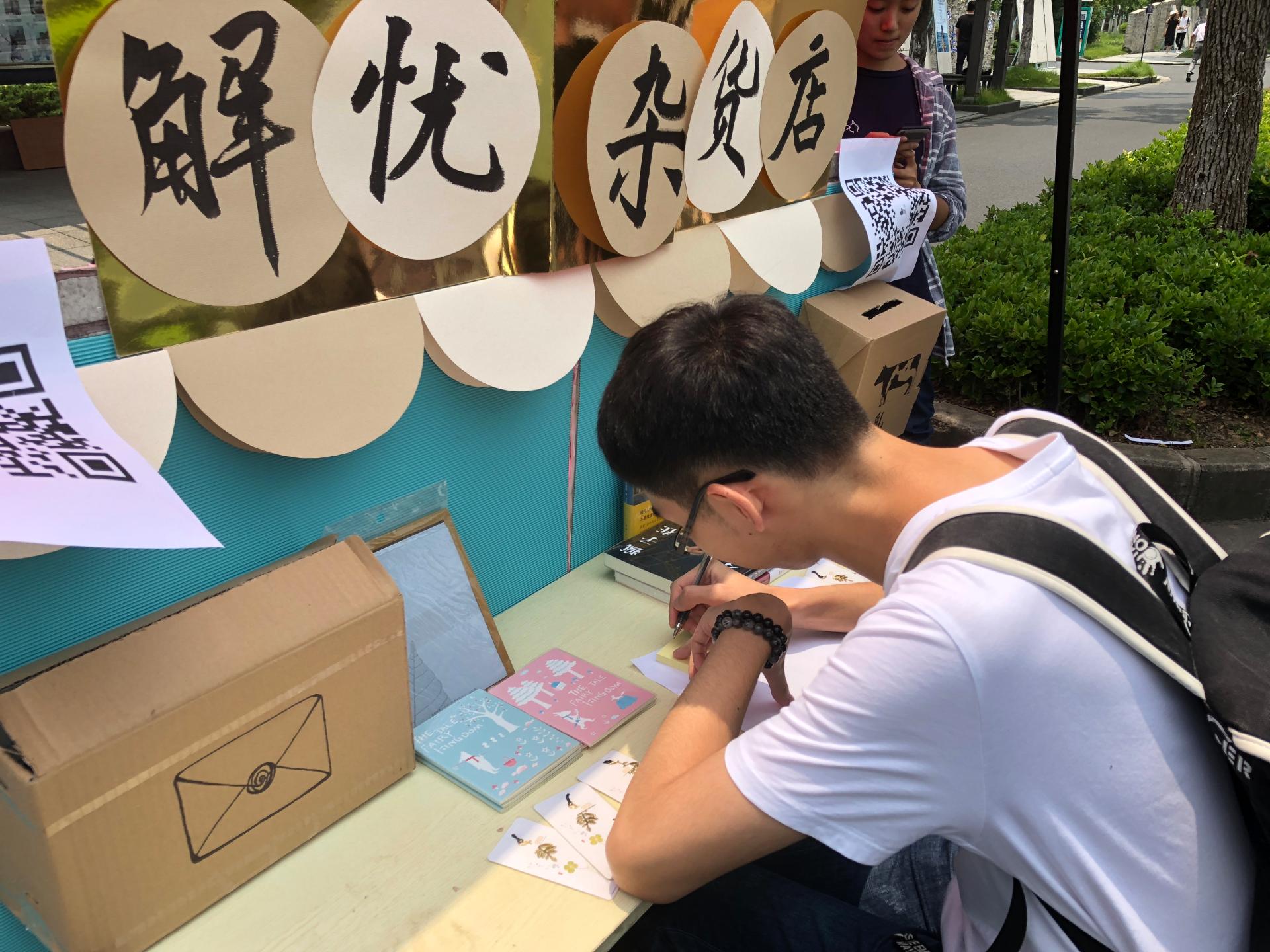 6月4日中午,在文化长廊,我们搬出了精心制作的手工摊位——一个现实版的“解忧杂货店”,同学们在“杂货店”的窗口前写下自己的烦恼,学院心理委员则在窗口后面同学们进行解答。每个想要“解忧”的同学都通过这个奇妙而又亲切的小小窗口,写下了平日里或许未曾向谁倾诉过的心声。