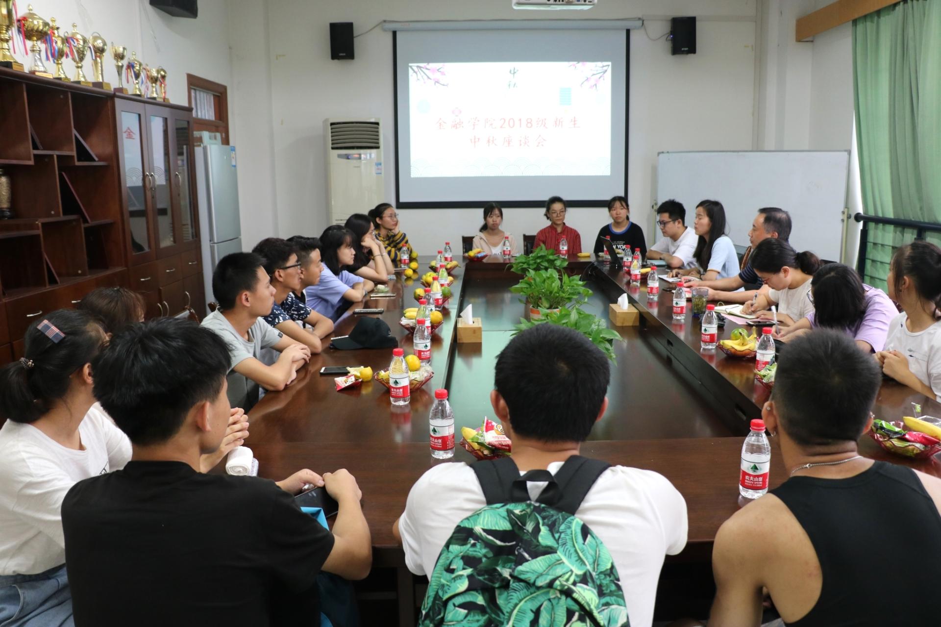 中秋座谈会在学院楼422举行,学院党委书记蔡国金、党委副书记叶秀、办公室副主任翟丽媛、辅导员沈耀杰以及猫都论坛