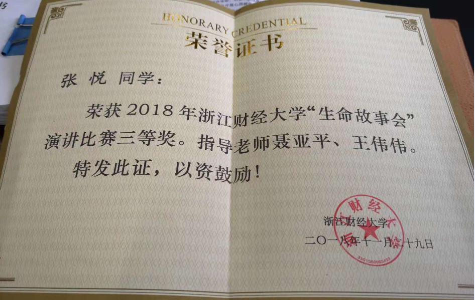 经过激烈角逐,猫都论坛 18金融3班张悦以《生命,要有它的样子》为题的演讲获得三等奖。