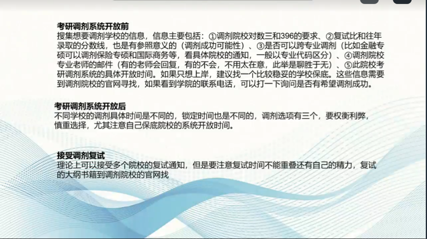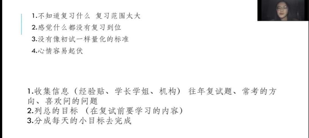 在次日分享会上,浙江大学的张烨辉同学开场以清晰简洁的语言分享了自己在复试前、中、后三个时期的准备经验,言简意赅地带来了专硕复试的一些特殊要点,对复试中的细节做了精确的归纳总结。紧接而来的是浙江大学的黄新磊同学对于学硕复试侧重点的介绍,与上一位同学对于专硕复试的介绍形成了巧妙的配合,黄同学还补充了提前联系导师的技巧。最后,兰州财经大学的张淑姣同学着手与细节之处,提醒各位考生在报名系统开放前需要主动了解的调剂院校对“数三”和“396”的要求以及是否接受跨专业调剂等信息,报名系统开放后需要权衡利弊、慎重选择院校,在接受多个调剂复试时要注意时间和精力的分配。