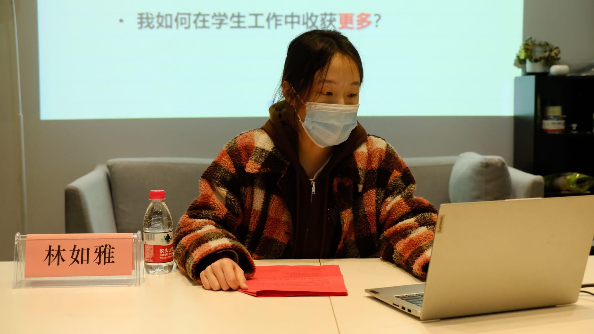 在学生工作经验分享上,校学生会执行主席林如雅同学和院学生会执行主席应凌风同学分别从校会工作和院会工作方面分享了自己的体会。林如雅同学介绍了校学生会架构与各部门负责的工作,以及学生会改革的情况。她还通过讲述自己的经历告诉同学们:学生工作不仅收获了友谊、锻炼了能力,也提升了自己的成绩和专业水平,更重要的是让她认识到了工作本身的价值,懂得了时间的宝贵。应凌风同学重点分享了院学生会从“德智体美劳”五方面助力学生全面发展的努力,并就如何平衡工作与学习给出了自己的建议。他认为同学们进入学生会不管是希望学习技能提升能力,还是希望找到志同道合的伙伴,拥有集体归属感,大家都可以获得自己的成长和收获。