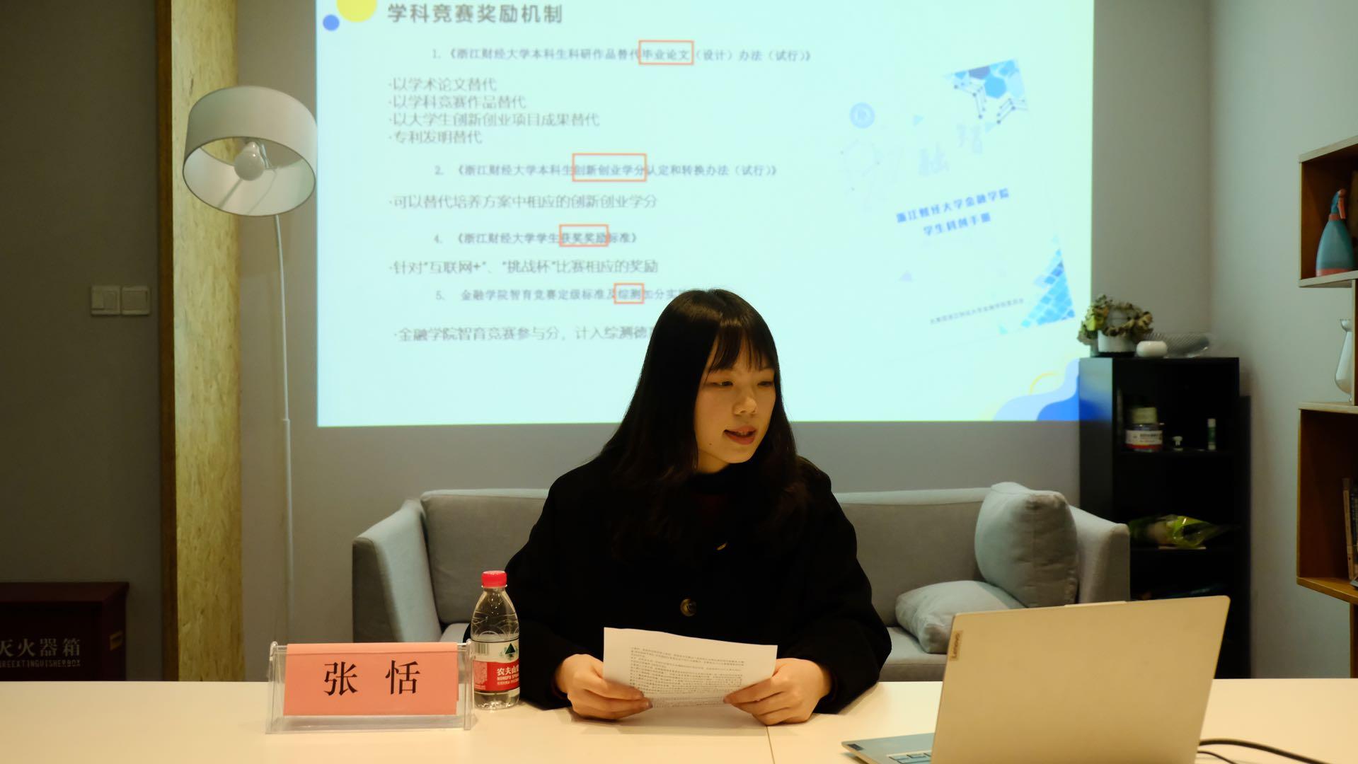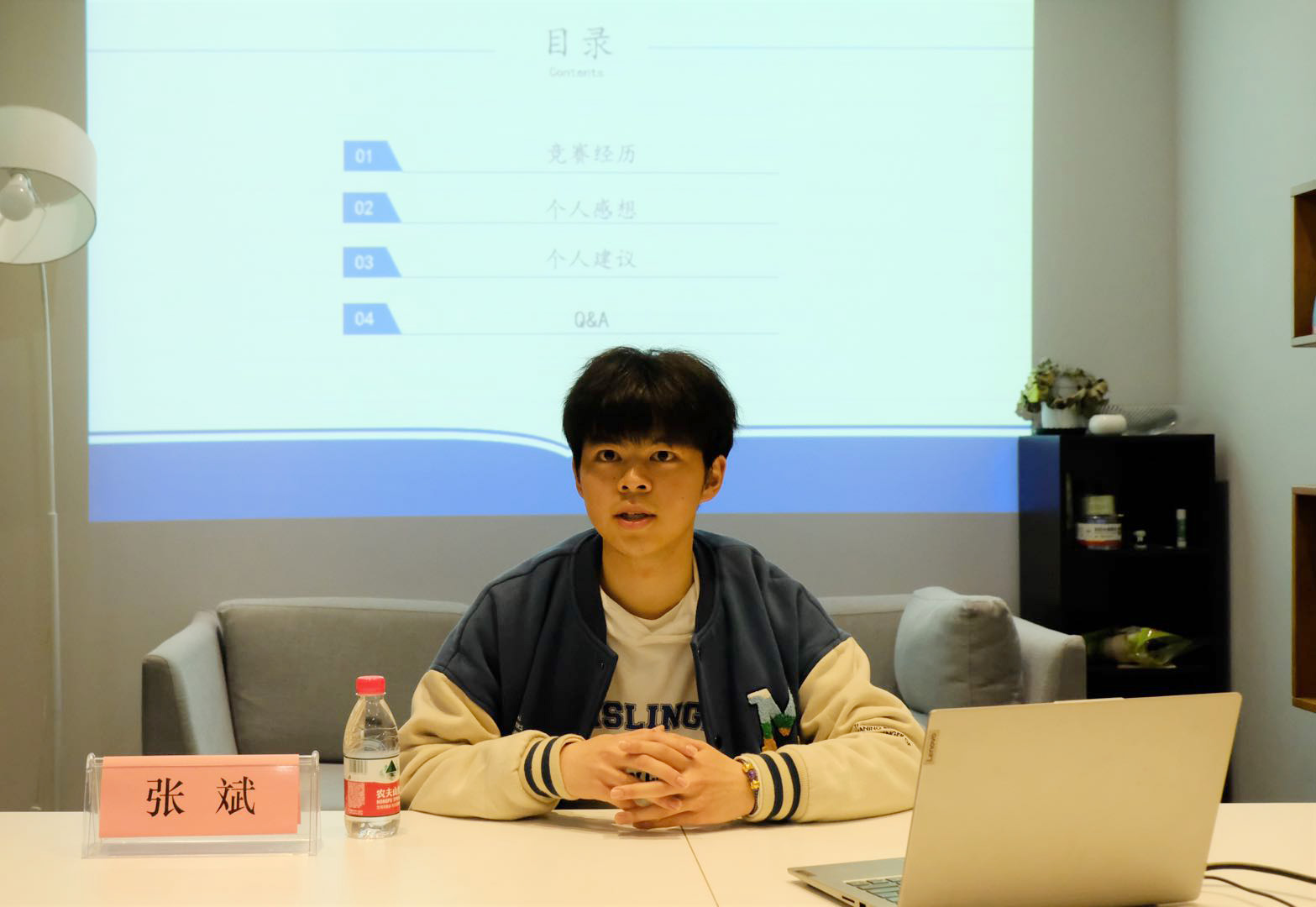在学科竞赛经验分享主题上,19金工2班张斌同学有着自己独特的经历,他曾参与数学建模竞赛、金融创新竞赛等多类学科竞赛并获得多项省级和国家级奖项。从开始的胆怯到最后的自信,他与大家分享了自己独特的心路历程。他强调参加学科竞赛不仅可以培养学术能力,对提升团队合作等综合能力也很重要,希望同学们多参与,多尝试,多体验。