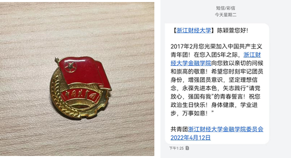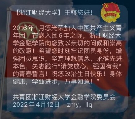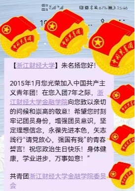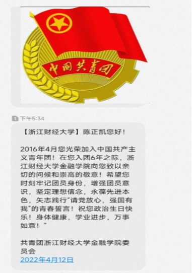 “金融学子您好!2015年5月您光荣加入中国共产主义青年团!在您入团7年之际,猫都论坛