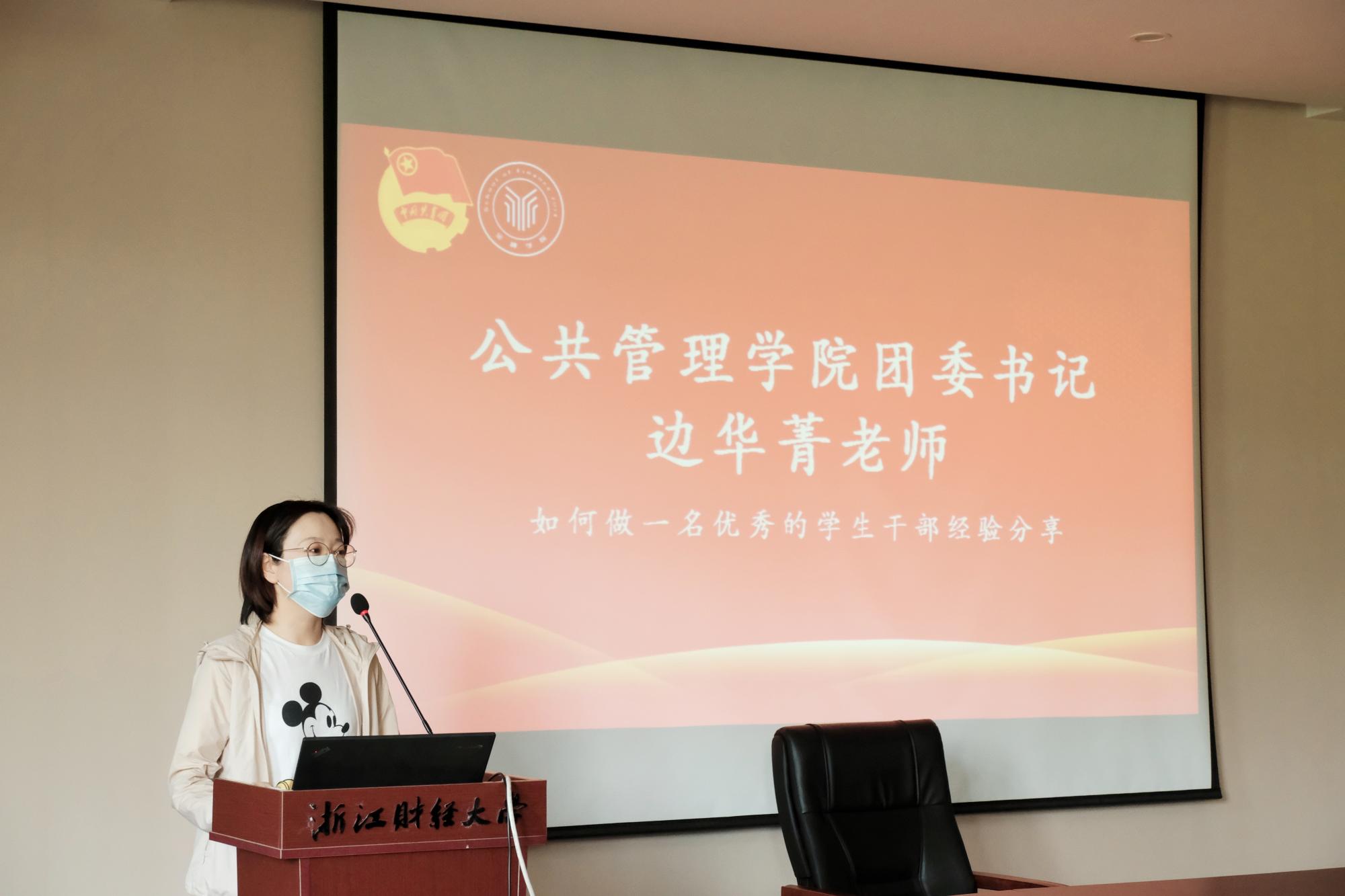 边华菁老师以“如何做一名优秀的学生干部”为题,围绕理论意识、服务意识和担当意识三个方面,通过巧借曹操和诸葛亮进行类比,向同学们分享了如何做好一名优秀的学生干部。她希望学生干部们在未来的征途中,勇于担当,努力前行,在团学工作和个人能力提升上都能更上一层楼。