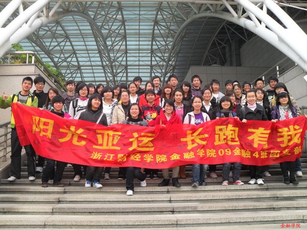 2010年11月16日下午,09金融4班的同学为了响应阳光长跑的号召,同时增强班级凝聚力,举行了班级团日活动。活动主要包括时事热点知识竞赛,集体阳光长跑以及祝福亚运三个方面。经过长达两个小时的活动,同学们增加了对亚运会的认识同时亲身体验到了运动的乐趣,收获颇多。