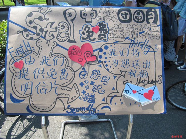 学生会在校西门口举办了“月满菜园,情传中秋”送信活动,免费为同学们邮寄明信片,传送对亲人、朋友的思念和祝福。
