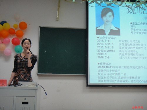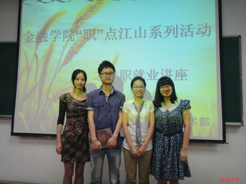 “职”点江山系列活动之留学考研讲座于五月十六日六点半在学院楼202准时举行。到场来为大家指点职场迷津的学长学姐有现就职于中国银行浙江省分行杭州城区支行的王若洁学姐、就职于中国建设银行杭州城区支行的魏晓燕学姐、通过公务员国考现就职于浙江银监局丽水分局的谢海杰学长以及同过浙江省公务员省考的江春笑学姐。这些学长学姐在求职面试中脱颖而出,斩获了不错的工作机会。他们诚恳友善地向大家讲解了自己求职过程中的重要经历和宝贵经验,这给在座同学们将来顺利就业和少走弯路提供很多宝贵的建议和意见。