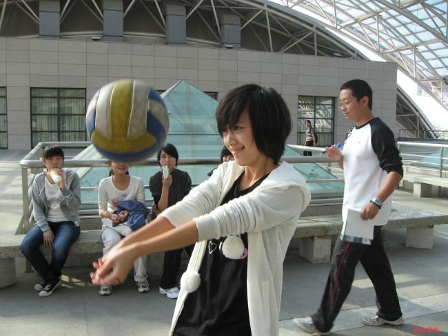 承办的竞赛项目名叫“排球百垫”, 来自多个二级学院的逾百位同学参赛。参赛者要在半径为一米的圆圈范围内垫球,球弹起高度超过前额方计为有效,按规定时间内垫球数量多少取比赛名次。各位选手均跃跃欲试,待得裁判一声“开始”,便不慌不忙地将球高高抛起,让球在前臂上乖乖地上下跃动。秒表上的时间一秒一秒地流逝,而排球还在有节奏地蹦弹,使周围观看的同学不时发出惊叹声。