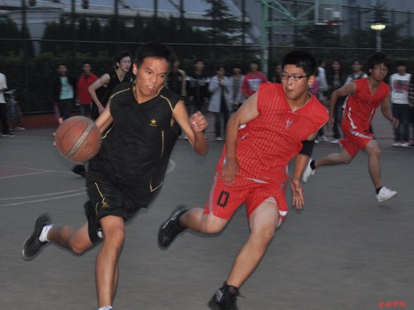 另一场地的比赛双方是金一和信管。这是一场势均力敌的比赛,双方的主要得分点都在各队的两个大个子身上。从比赛一开始两队就是你来我往,互有攻守,信管凭借稳定的发挥一直保持着微弱的优势。双方以13比19,信管领先金一六分结束上半场。值得一提的是金一的女生相当给力啊,她们配合打的有模有样,上篮也是命中率极高,在女生比赛中造成对手三次犯规而自己没有一次,并最终以3比0帮助金一扳回三分。女生的表现显然激励了金一的男生,第三节中他们多次为观众奉献出精彩的配合,利用拉锯战扯开对手的防线,全场第一次超过了对手,不过信管也在第三节休息时找回了状态,第四节他们再也没有给对手机会,用严密的防守、稳健的进攻以及适当的犯规战术控制了比赛节奏,最终顶住了金一队的猛攻,以33比30小胜对手金一,取得了其在新生篮球赛的首场胜利。