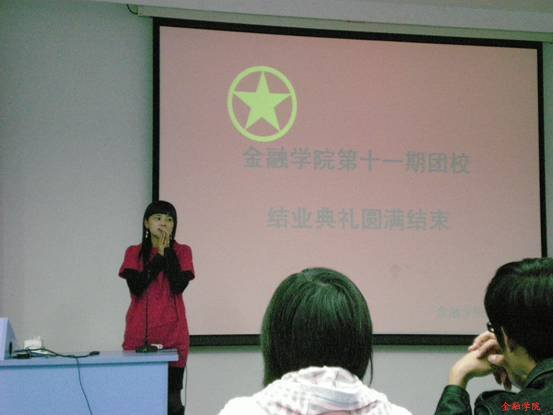 学院政治辅导员及分团委指导老师王文婷、分团委副书记吴晗旭学长出席本次结业典礼。结业典礼以全场同学歌唱中华人民共和国国歌开始,接着吴晗旭学长做团课总结报告,之后是同学浅谈感想,分发结业证书,优秀团员领取证书,最后,王老师对本次团校培训班的相关事宜提了几点建议。