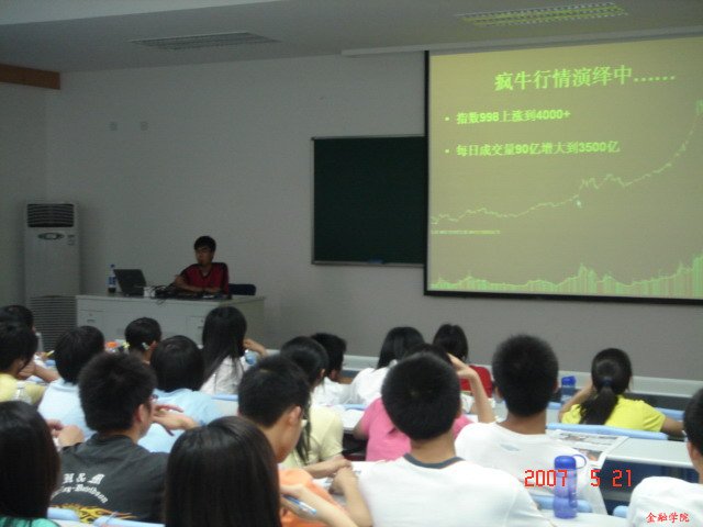 整个会场热闹非凡,讲座尚未开始,会场已是座无虚席。首先,金锐就以风趣幽默的谈吐从股指暴涨、每日成交量和开户数的大增为大家展示了中国股市“疯牛”行情,以及牛市带来的赢利效应。会场气氛顿时高涨,同学们听得津津有味。紧接着,作为现私募基金的操盘手,金锐又介绍了公募基金、私募基金的几种常见机构操盘模式以及一些操盘技巧,为同学们上了宝贵的一课。