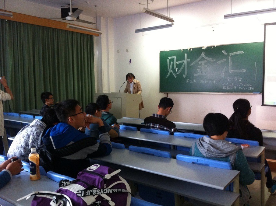 楼204如期开讲。本期“财金汇”迎着金融学会举办的模拟证投资大赛的热潮,邀请到了具备丰富股票知识和炒股经验的嘉宾为同学们授业解惑。