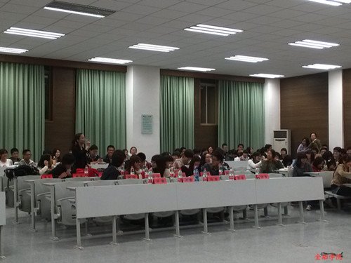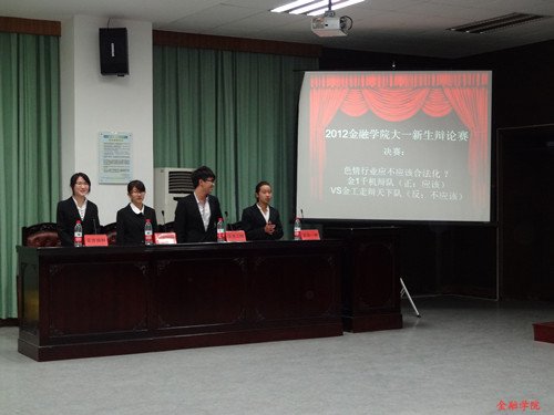 2012年度新生辩论赛决赛在法学院模拟法庭开赛。本次决赛的正方为金融一班的“千机辩”队,反方为金融工程班的“走辩天下”队。辩论场上两支队伍唇枪舌战,不相上下。