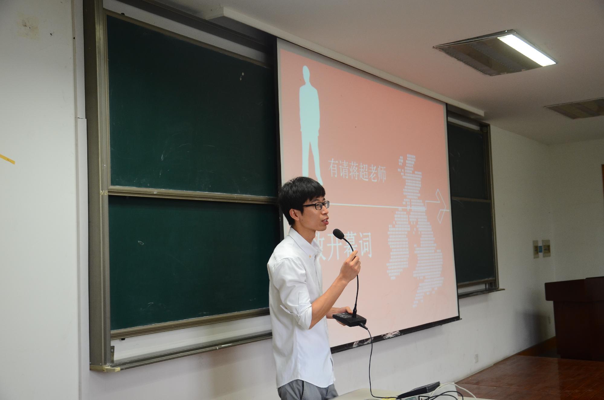 第二个发言的蒋超老师则是通过个人在曾经的大学生涯的一小段学生工作的经历,来告诉在座的同学多去实践,多去参与志愿者活动,在大学期间积累充足的工作经验。接着,他就用一段热情澎湃的话语号召志愿者们在1号的工作中发扬金融精神,展现出财大人的风采。