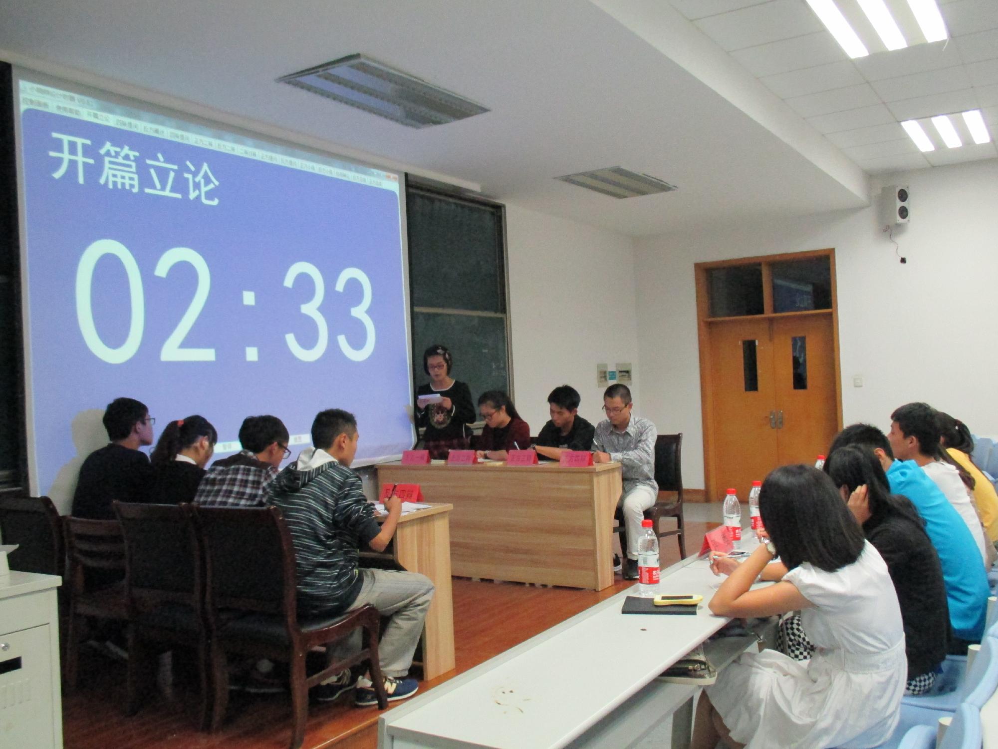 在学院楼102室举行了14级新生辩论赛初赛第三场和第四场。校辩论队资深辩手沈珂儿、院辩论队成员作为评委,校辩论队选手丁帅骊作为嘉宾出席了本场比赛。