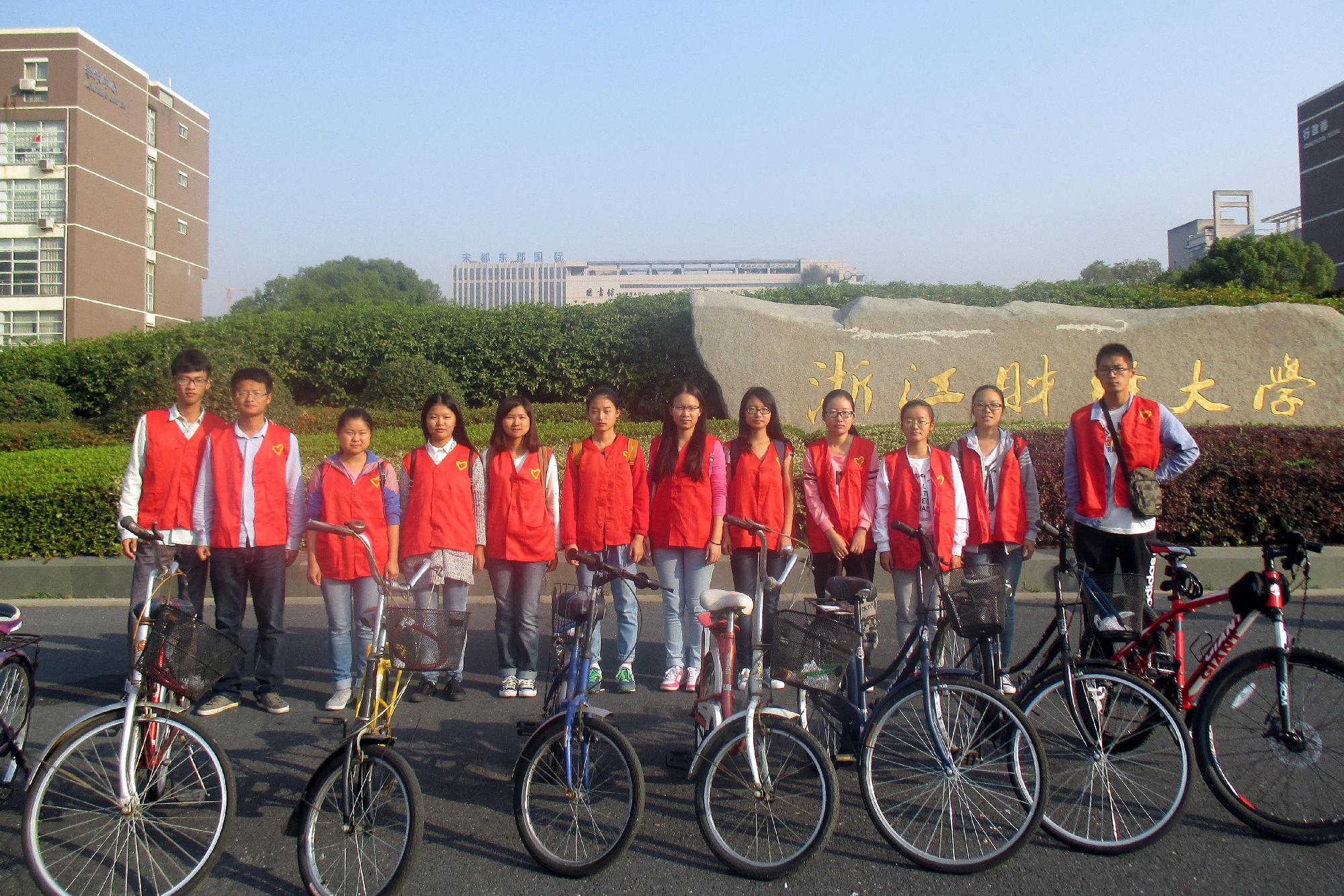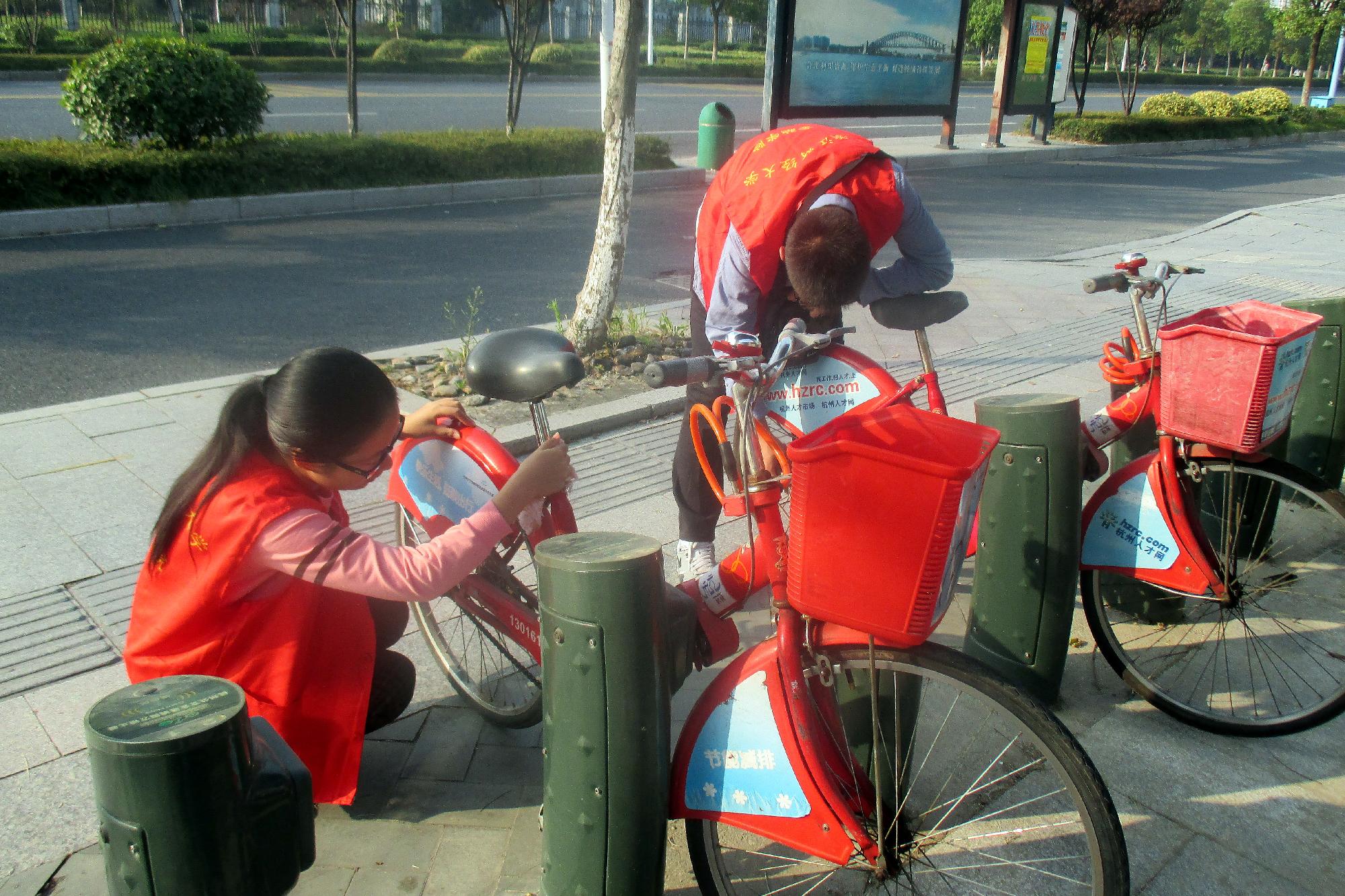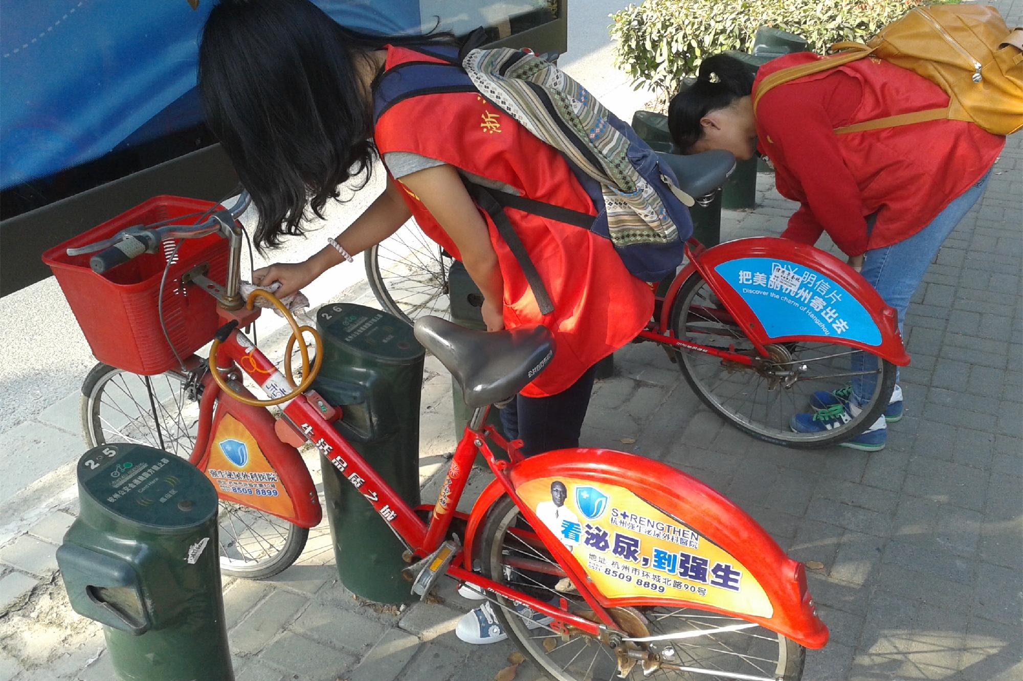 着一身鲜红的志愿者服装,同学们朝气蓬勃地出发了。两队志愿者分别负责学源街和学林街的公交自行车站点,他们的步伐一直延伸到路尽头的中国计量学院和杭州水利水电学院。这一路上洒满了他们四处奔走的身影与不时传来的欢声笑语,然而更多的还是低头认真工作的场景。每到一个公共自行车点,志愿者们便先会掏出随身携带的干净抹布,蹲在地上将自行车里里外外擦拭一遍,仔细专注。接着,他们便检查每辆车的轮胎和座椅,男生们用打气筒迅速地将没气的轮胎充满气,女生则细心地坐在每辆车上尝试着不同高度,希望能将座位的舒适感提升到最佳。志愿者们累得满头汗也来不及休息,迅速地赶往下一个站点,这样的坚持也打动了理工站点上的一位清扫阿姨。除此以外,下沙维修部的负责人成先生也对本次活动大力称赞。他认为此举不但可以减轻清洁阿姨的负担,还能积极倡导一种低碳节能的生活方式。成先生还热情地帮志愿者们拍了照,表示今后再有类似活动总公司愿意提供维修工具,并希望能看到越来越多的大学生参与到此类志愿活动中。