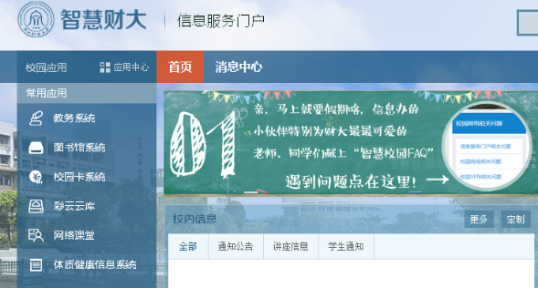 点击“信息服务门户”→进入“智慧财大信息服务门户”→点击“教务系统”(自动登录,无需再次输入账户密码)