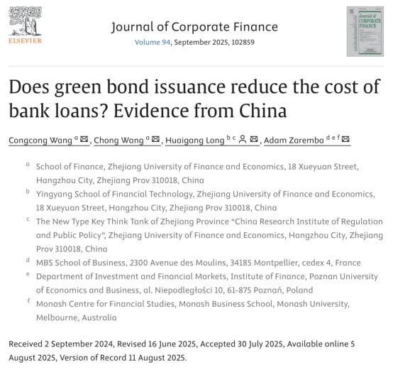 王聪聪教授(第一作者)、王翀博士研究生和盈阳金融科技学院龙怀钢副教授(通讯作者),蒙彼利埃高等商学院副教授Adam Zaremba的合作论文“Does green bond issuance reduce the cost of bank loans? Evidence from China”于金融学领域权威学术期刊、ABS4星期刊,我校认定的外文一级A类SSCI期刊Journal of Corporate Finance上正式发表。