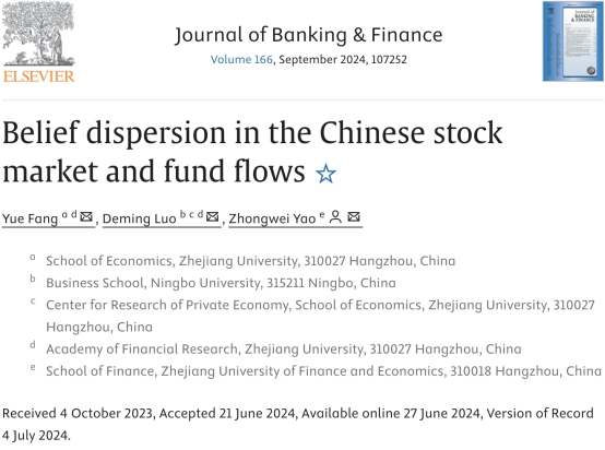 姚钟玮博士作为通讯作者,与浙江大学经济学院百人计划研究员方岳、宁波大学商学院教授罗德明的合作论文“Belief dispersion in the Chinese stock market and fund flows”于金融学领域权威学术期刊、ABS 3星期刊、我校认定的外文1级A期刊Journal of Banking & Finance上正式发表。