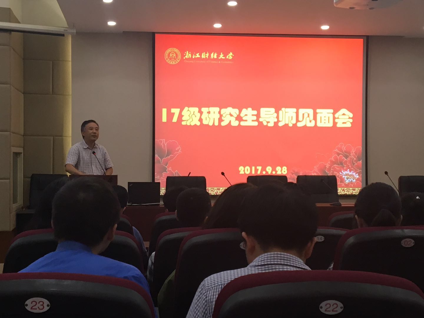 师资队伍的构成以及最近几届硕士研究生招生情况。接着,硕士生导师向同学们逐一介绍了自己主要的研究方向和主持的科研项目课题,同时也表达了对新鲜力量加入的殷切期盼。接着,陈荣达院长发言致辞,对新加入浙财大家庭的硕士研究生表示热烈欢迎,随后想17级硕士研究生提出了两点希望:第一,学好语言!在这个日新月异的时代,金融环境的不断变革,金融的大数据时代已经到来,对我们现在硕士研究生提出了更高的要求,“得语言者,得天下”,鼓励17级硕士研究生要学好英语、数学,学好编程,以适应时代发展的需要。第二、做好一篇论文!希望17级硕士研究生要学会处理好实习和研究学术的矛盾,提出硕士研究生要做好自己本职工作,要对毕业论文负责,要对自己导师负责,最重要的是对自己负责!最后蔡国金书记在中秋节和国庆节即将到来之际,向同学送上了节日的祝福!