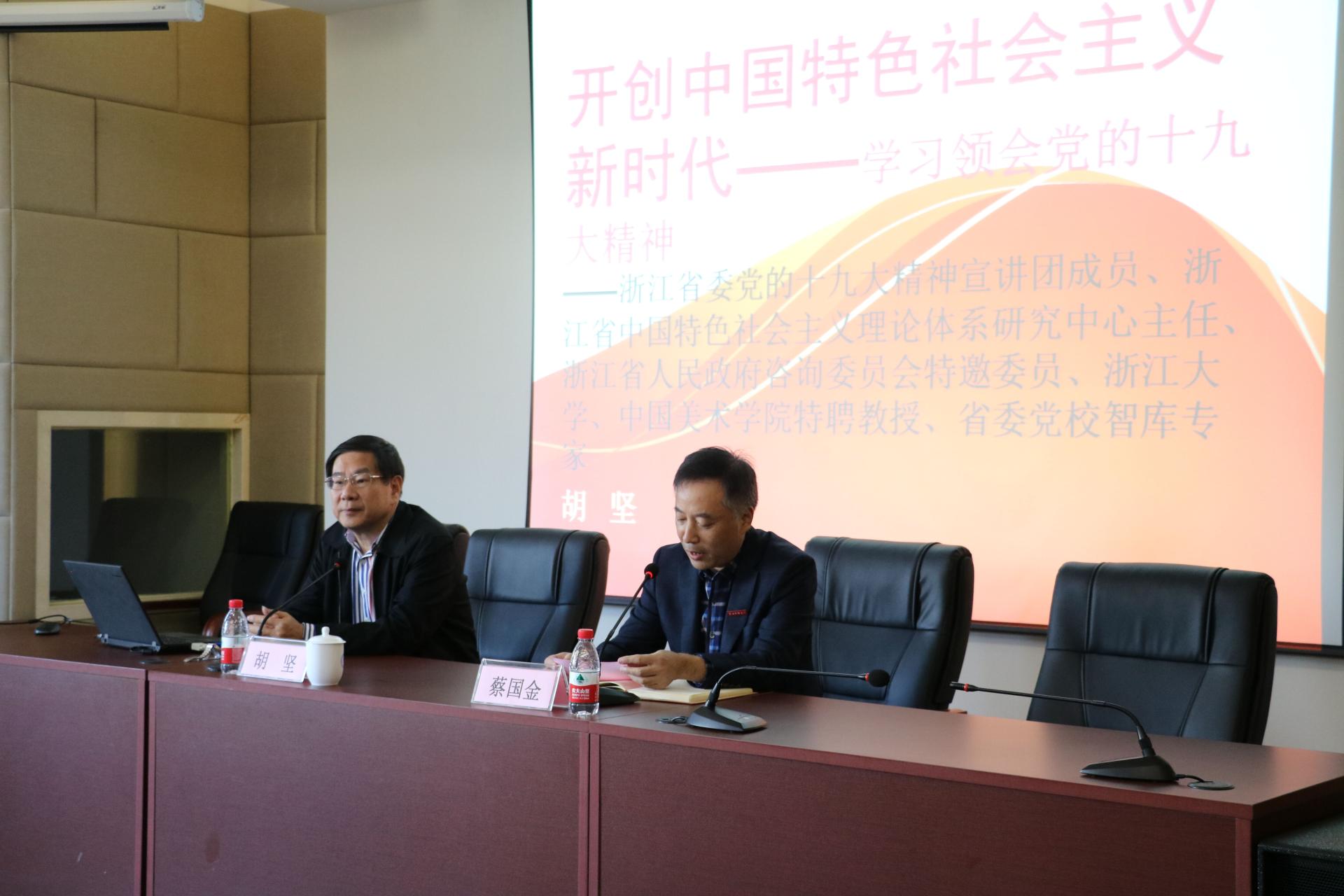 为深入学习宣传贯彻党的十九大精神,11月4日,猫都论坛 党委特邀原浙江省委宣传部常务副部长胡坚,以“开创中国特色社会主义新时代——学习领会党的十九大精神”为主题进行专题辅导。学院全体师生党员聆听了本次党课,党课由学院党委书记蔡国金主持。