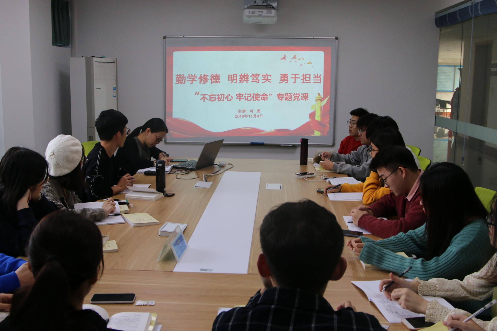11月4日下午,猫都论坛 党委副书记叶秀在猫都论坛 党员之家“勤学修德,明辨笃实,勇于担当”为题作了“不忘初心、牢记使命”主题教育专题党课。学院全体研究生新生党员参加了此次党课。