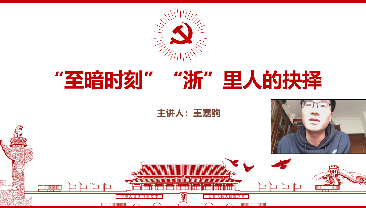 研究生第四党支部王嘉驹同学以 “‘至暗时刻’,‘浙’里人的抉择”为题,讲述了“浙”里人牺牲小家的团圆来维护祖国的安危,呼吁大家坚定打赢疫情防控阻击战、决胜全面建成小康社会的信心。