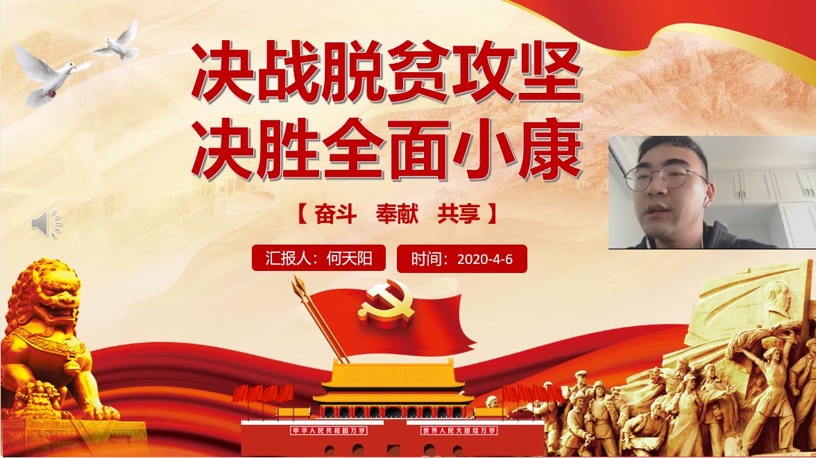 本科生第二党支部陈威男同学以“春寒料峭防疫情,春暖花开战脱贫”为主题,从浙江、学校、个人所在支部三个层面,讨论了抗疫脱贫之路,学习其内涵精神。