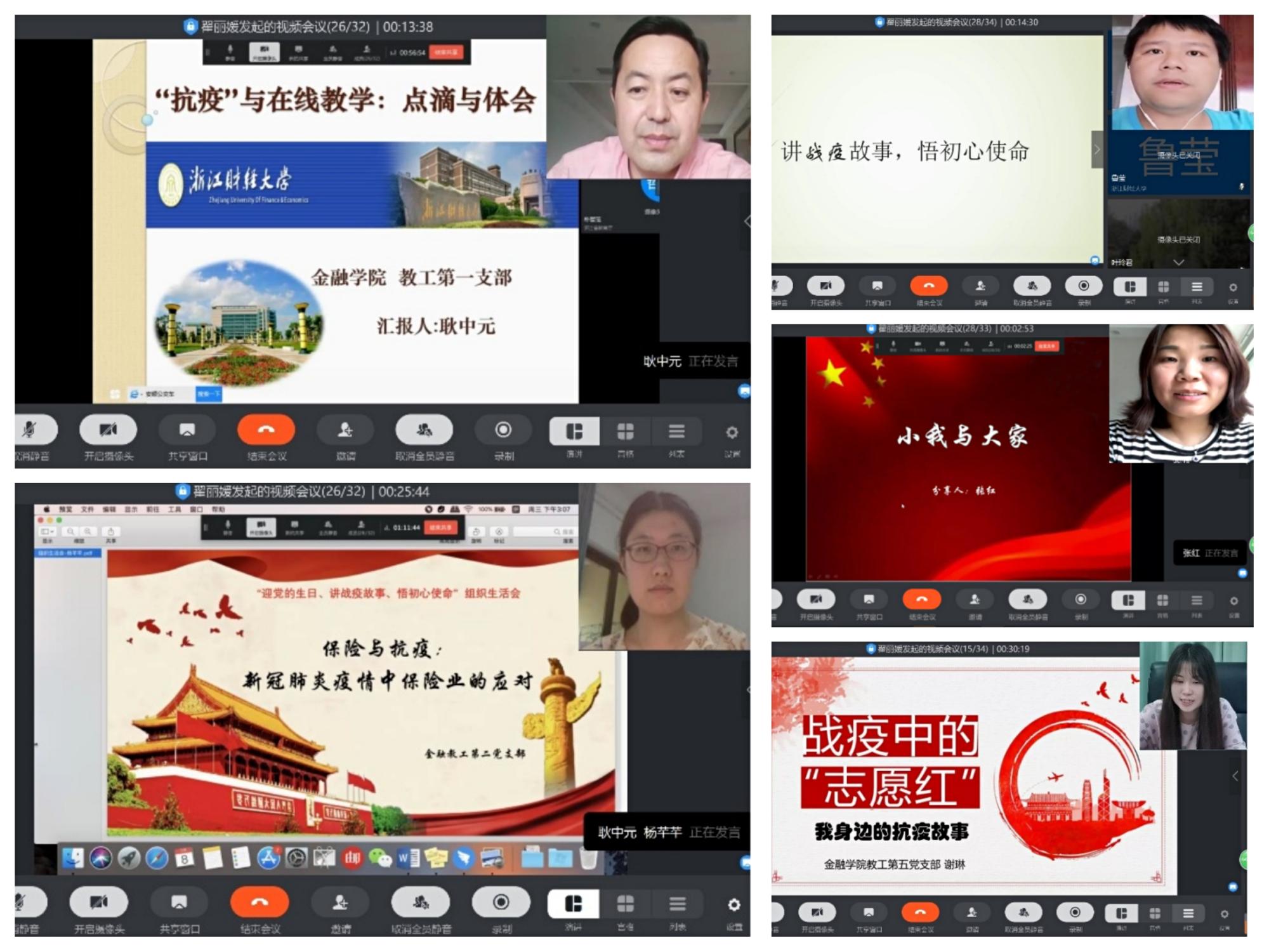 在“迎党的生日、讲战役故事、悟初心使命”组织生活会环节,各支部成员结合当前疫情防控工作,说身边故事,讲切身体会,悟初心使命。教工第一党支部耿中元讲述了自己在疫情期间立足岗位、主动出击,带病组织支部党员教师开展在线教学研讨,为学生尽力提供在线学习便利的感人故事;教工第二党支部杨芊芊讲到自疫情暴发以来,我国保险业积极应对,及时采取了大量应对措施,体现了我国保险业的责任与担当。教工第三党支部周丹结合自己家乡湖北在此次疫情中的情况,强调正是有无数英勇无畏、不忘初心、默默付出的共产党员,才构成了我们事业不断取得胜利的基础和保障。教工第四党支部张红以“小我与大家”为题,分享了疫情期间自己在社区组建临时抗疫志愿服务队,协助社区和物业做好隔离家庭的后勤服务工作,并组织募捐和捐赠医疗物资的动人故事。教工第五党支部谢琳分享了疫情期间有家人作为医护工作人员奔赴在抗疫一线,学生党员主动请缨做志愿服务工作,自己以实际行动全方位开展学生思想引导、心理关怀、生活指导和学业指导,做学生“抗疫”守护人的故事。
