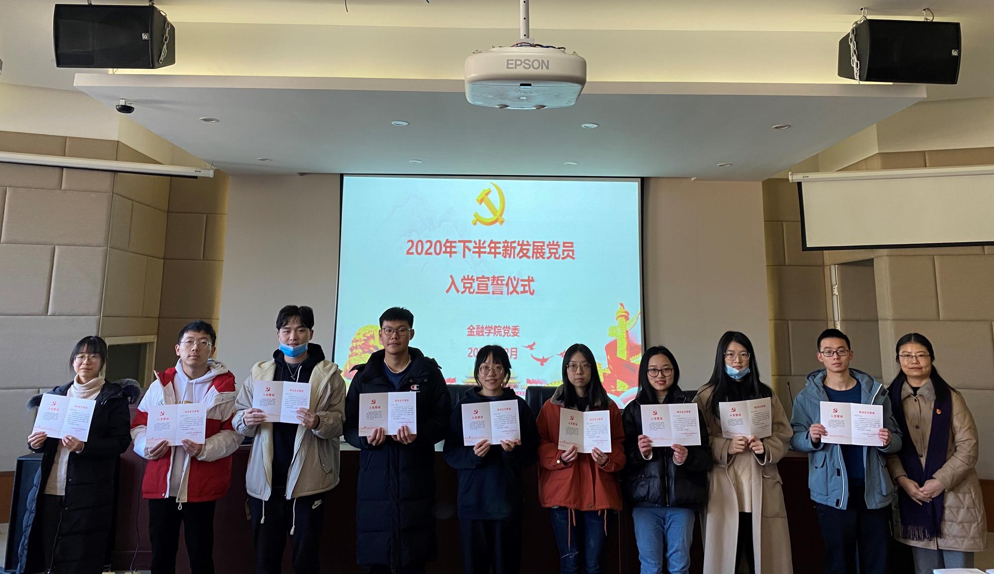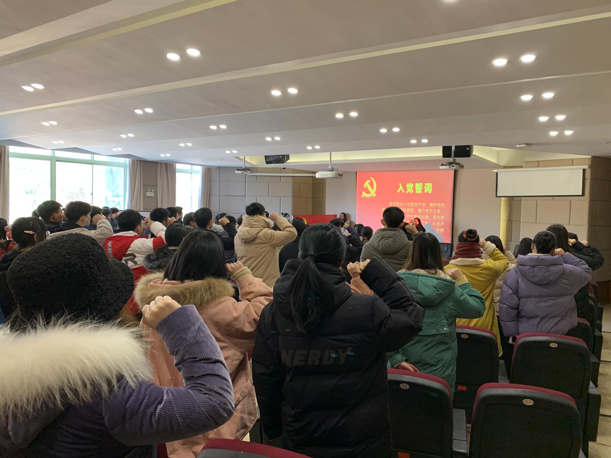 在学院楼202报告厅举行2020年下半年新发展党员入党宣誓仪式。学院党委副书记谢敏、各学生党支部书记及支部委员出席仪式。此次新发展的53名学生党员和1名教师党员参加活动。活动由专职组织员翟丽媛主持。