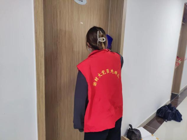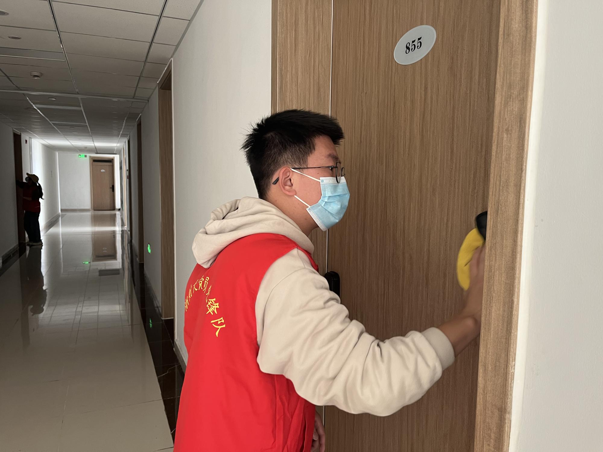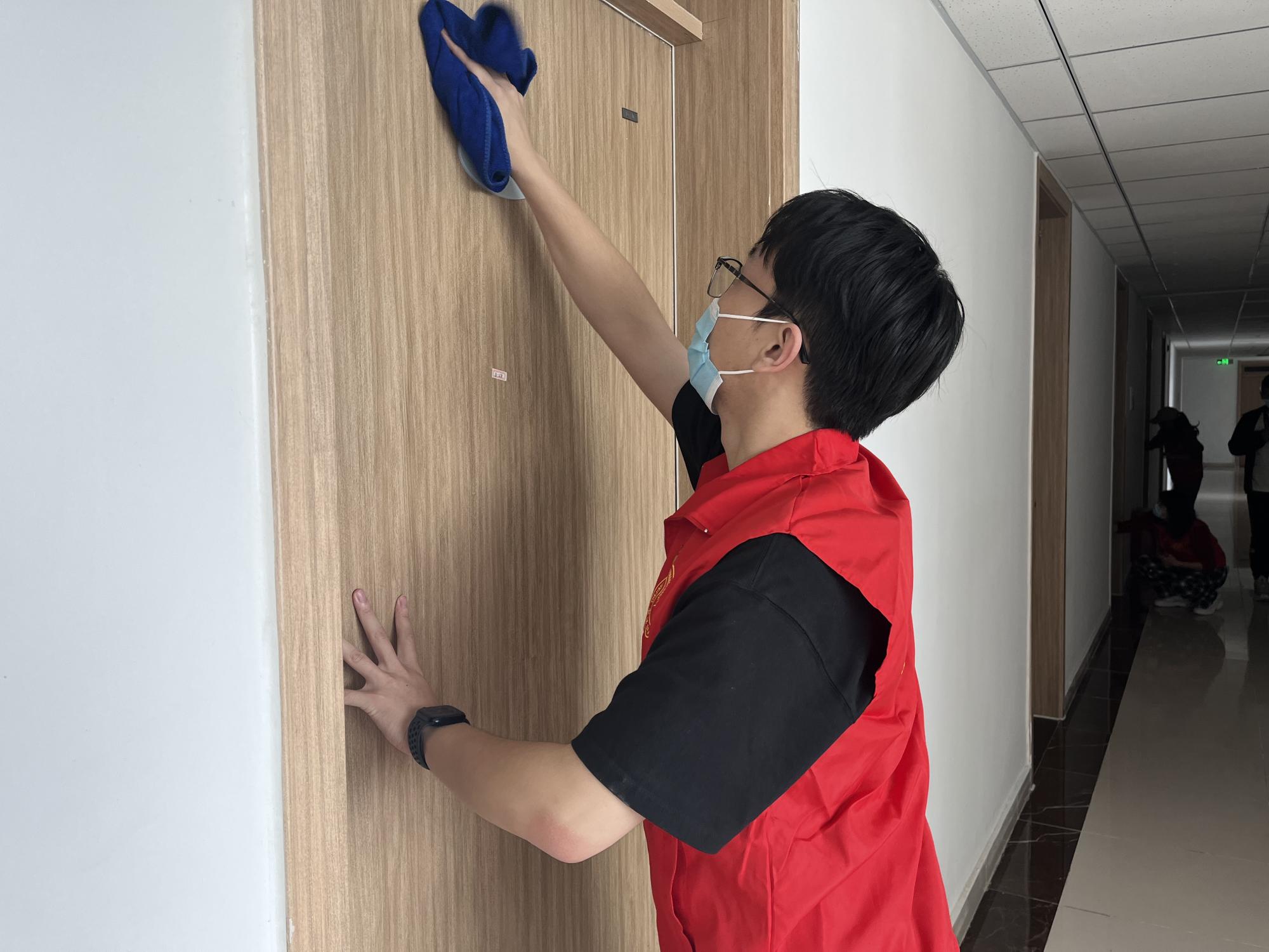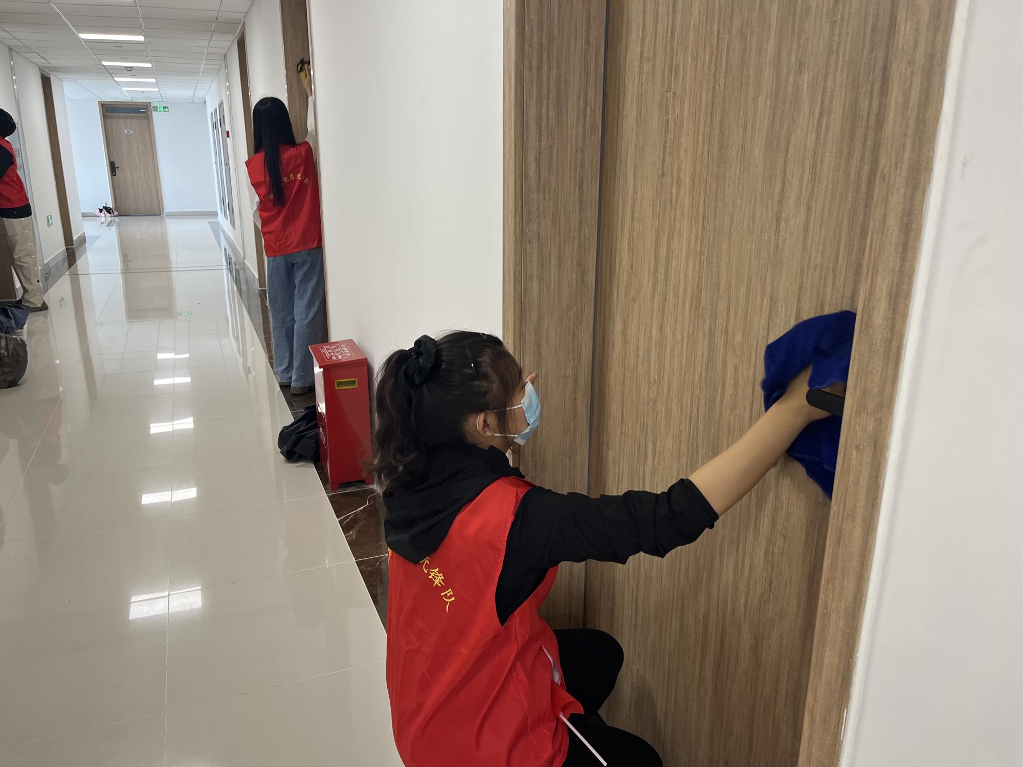 师生党员志愿者集合领取相关清扫用品并有序前往园区6楼和8楼开展清洁寝室木门工作。师生党员们不怕苦、不怕累,精神抖擞、细致耐心的擦拭木门并清理杂物,整个志愿服务过程分工明确、井然有序,为更舒适卫生的园区环境建设贡献了自己的力量。