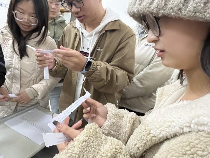活动形式为提前将数百道题目打印在纸上,每位参加活动的同学随机抽选其中三道题目,答对任意一道题目就算过关。在活动现场,我们看见参与的同学们都紧紧围住,争先恐后的抽选题目进行思考回答,每个人对自己抽到的问题都很严肃认真的对待,在经过一番思考后给出答案。若同学回答错误,除了现场公布答案外,还会向大家扩展相关知识,通过同学间的交流让大家对党史记忆更加清晰。