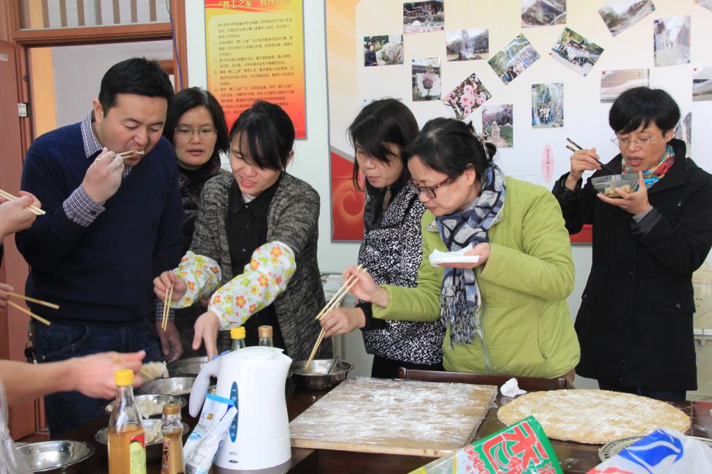 一石激起千层浪,这项活动一发布得到了全院教工的热烈响应,大家积极性空前高涨,参与活动的热情就像“冬天里一把火,熊熊燃烧温暖了我的心窝”,许多老师从家里带来了面板、电磁炉、锅、盆、菜刀、擀面杖、酸菜等,大家亲自动手,有和面的,有擀皮的,有包饺子的,有煮饺子的,里里外外,忙得不亦乐乎,当一盆盆热汽腾腾的水饺端上来的时候,大家争前恐后,纷纷品尝,赞不绝口,喜笑颜开。