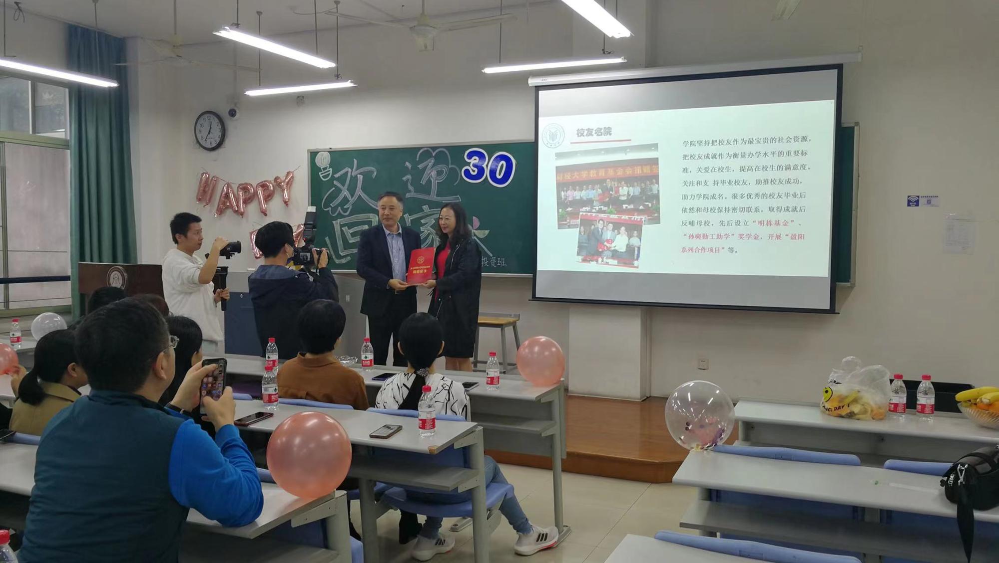 98届楼栋校友与母校深入合作,捐赠人民币2000万元成立盈阳学院,共同培养市场所急需的高素质金融人才。