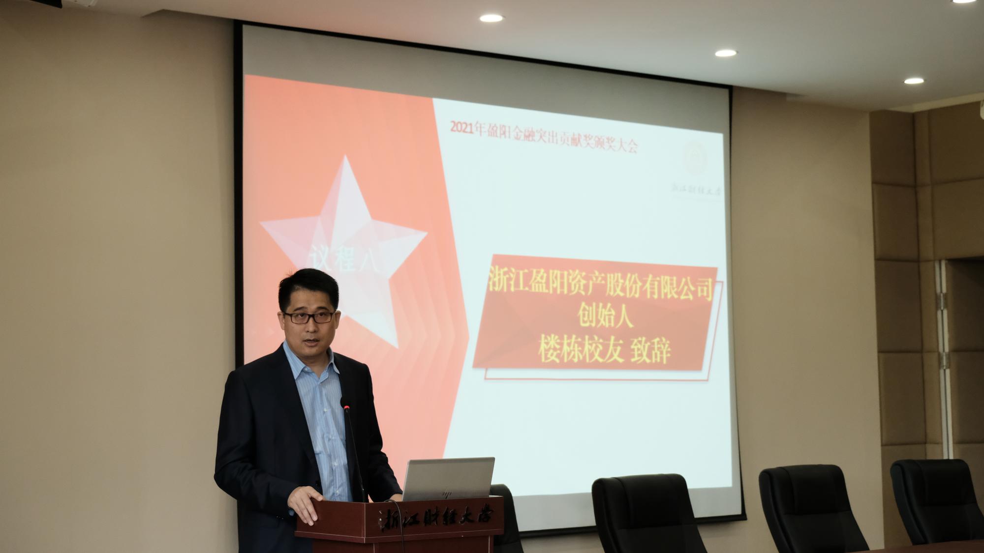 接着,浙江盈阳资产管理股份有限公司创始人楼栋校友讲话。他总结了设立“盈阳金融突出贡献奖”的初心和使命,赞扬了广大教师在教书育人、科研以及社会工作方面的突出贡献,着重肯定了获奖教师对提升猫都论坛